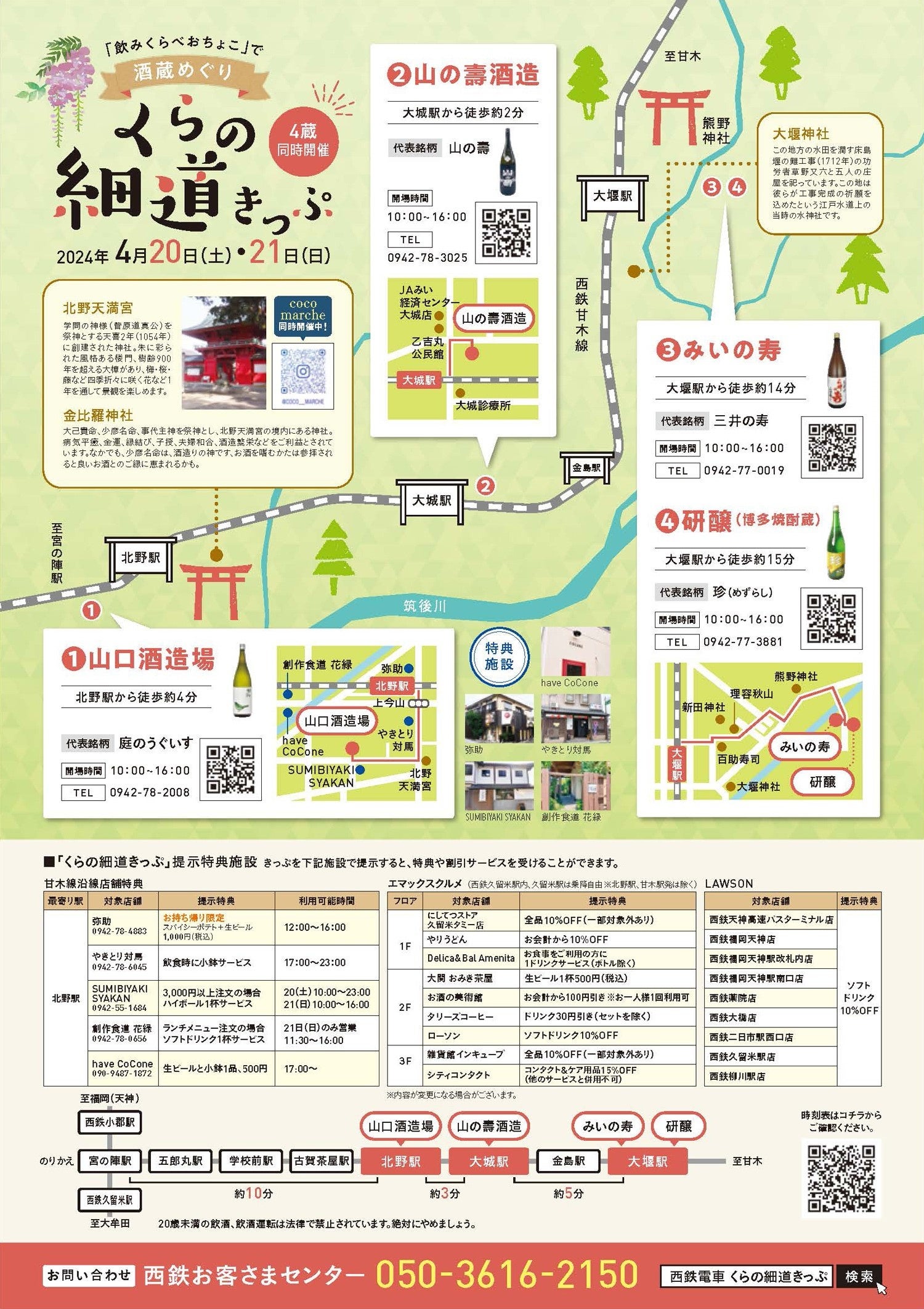 ※3くらの細道きっぷは、西鉄電車甘木線沿線の4か所の酒蔵とタイアップした企画乗車券です。甘木線沿線の久留米市北野町・三井郡大刀洗町で、春の訪れとともに昔懐かしいぬくもりのある風景(=細道)を味わいながら、西鉄電車に乗車して個性豊かな4か所の酒蔵(=くら)を回る”酒蔵めぐり”をお楽しみいただけます。