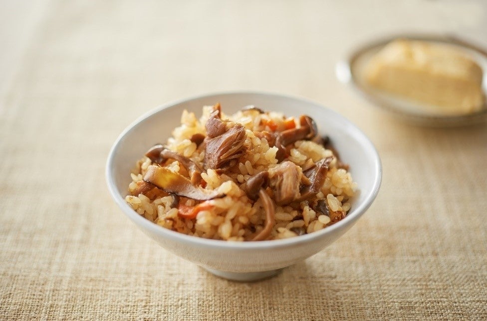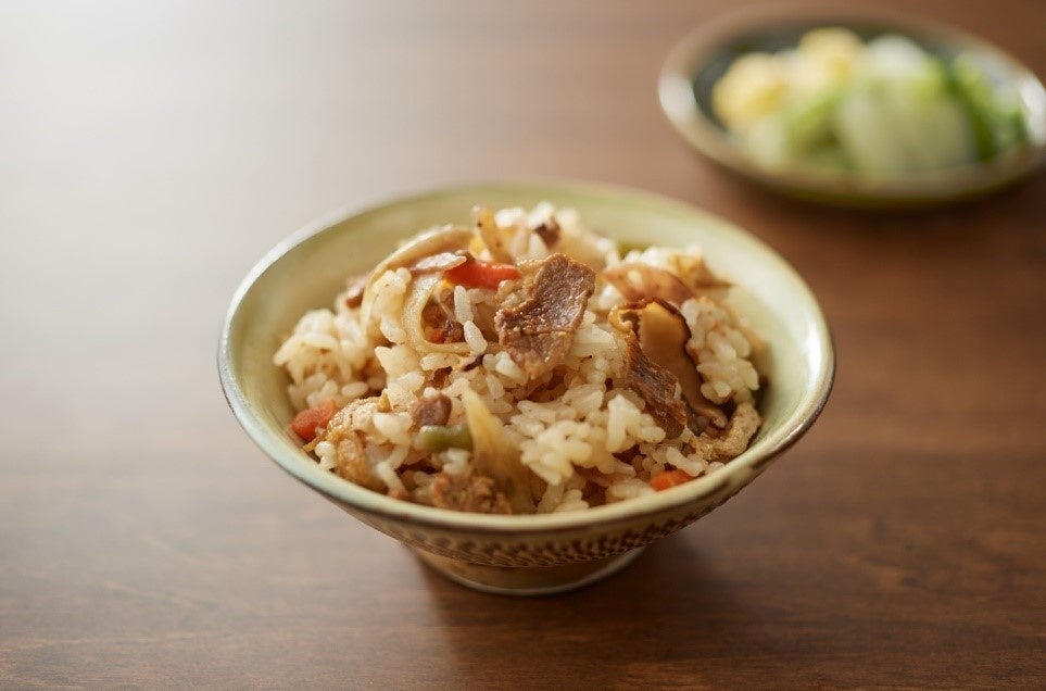 具材感と旨みが味わえるよう2種類の牛肉を組み合わせました。油揚げやしいたけで旨みを加えたり、彩りでふきと人参を入れたり、様々な食感を楽しめるようにこんにゃくやたけのこを入れることで、こどもにも大人にも人気のある五目ごはんが炊き上がります。
