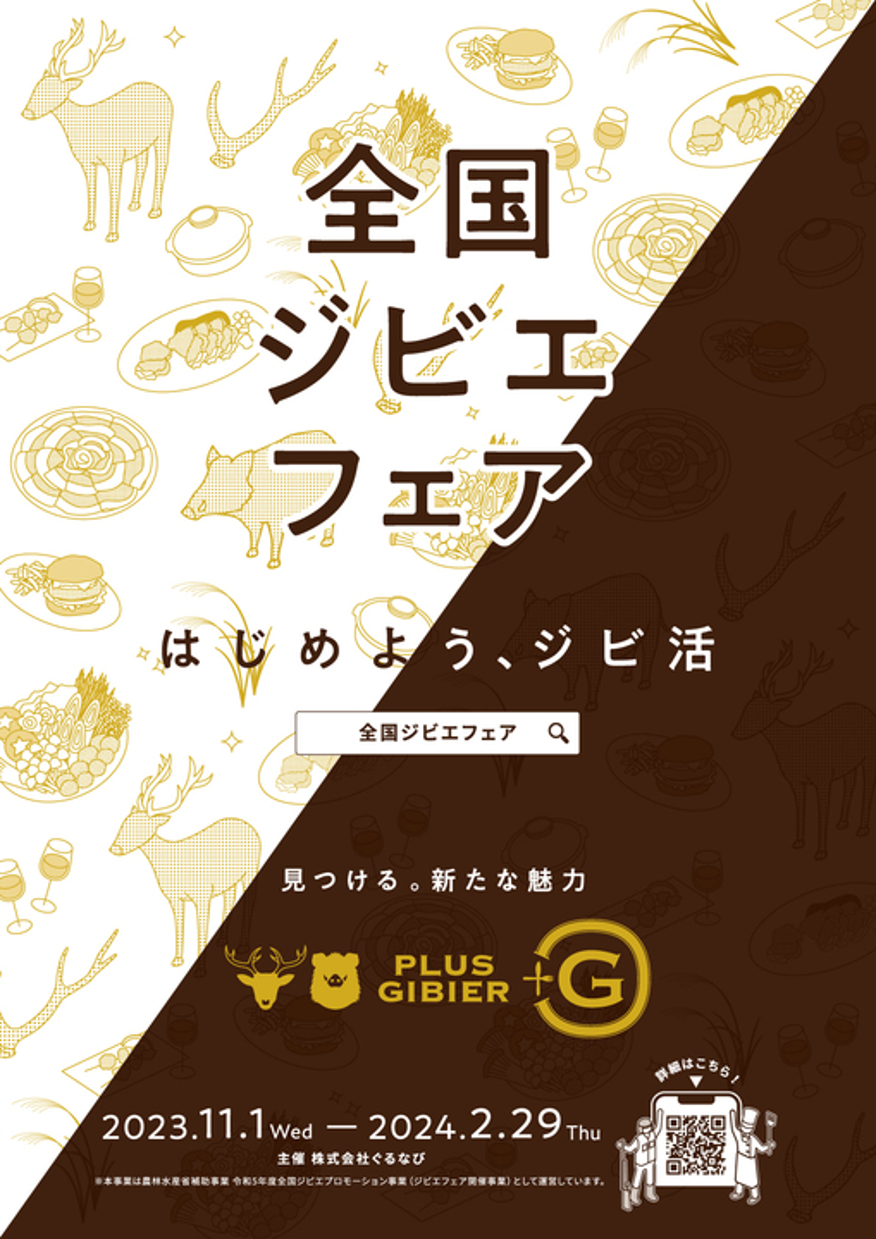 株式会社ぐるなび(本社:東京都千代田区、代表取締役社長:杉原章郎 以下、ぐるなび)は、農林水産省「令和5年度全国ジビエプロモーション事業(ジビエフェア開催事業)」の事業実施主体として、国産の野生鳥獣肉(以下、ジビエ)等の消費拡大のため「全国ジビエフェア2023」を2023年11月1日(水)から2024年2月29日(木)まで開催します。全国のジビエメニューを提供する飲食店・ホテルや、ジビエの加工品、ペットフード、皮革製品等を販売する小売店、ECサイトを特設サイトで紹介し、国産ジビエの魅力を知ってもらい、消費者の「ジビエを食べよう!ジビエを買おう!」を推進します。