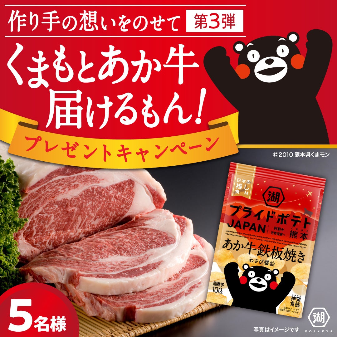 「湖池屋プライドポテト JAPAN あか牛鉄板焼き わさび醤油 熊本」の発売をきっかけに、“くまもとあか牛”の魅力を全国のみなさまに知っていただきたく、“くまもとあか牛”の歴史や魅力、生産の裏側などをまとめた「作り手の物語記事」をweb上にアップしました。当キャンペーンは、こちらの記事をお読みいただいた上でシェアしていただくと、ご応募できる形式となっています。プレゼントには「湖池屋プライドポテト JAPAN あか牛鉄板焼き わさび醤油 熊本」とともに、豪華な“くまもとあか牛”のステーキをご用意しています。記事を通して“作り手の想い”をご覧になられた上で、ぜひ日本の推し食材“くまもとあか牛”が当たるキャンペーンにご応募ください。