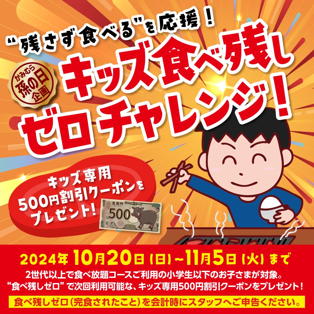 ワタミ株式会社(東京都大田区、以下ワタミ)と国内有数の和牛生産者であるカミチクグループ(鹿児島県鹿児島市)との合弁会社、ワタミカミチク株式会社(東京都大田区、以下ワタミカミチク)が展開する「かみむら牧場」は、2024年10月20日(日)から11月5日(火)までの期間、2世代以上で食べ放題コースご利用の小学生以下のお子さまを対象にして“食べ残しゼロ”で次回利用可能なキッズ専用500円割引クーポンをプレゼントする「キッズ食べ残しゼロチャレンジ」企画を実施いたします。