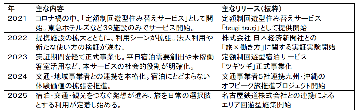 従来、宿泊は週末や連休など特定のタイミングに集中しやすく、特別なときに利用するものとして捉えられてきました。本サービスは定額制という仕組みを通じて、平日にも気軽に宿泊するという新たな利用スタイルを提案することで、宿泊の前提を少しずつ変え、ハレの日に限らない旅行需要の創出を進めてきました。また、多様な宿泊施設ネットワークの構築により宿泊施設やその周辺地域に新たな旅の需要を創出し、宿泊施設の未稼働客室の活用、観光需要の平準化、地域における関係人口の創出にも貢献しています。