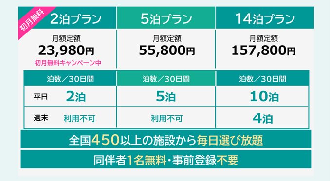 2泊・5泊・14泊の計3プランを販売しています。また、「2泊プラン初月無料キャンペーン」を実施中(終了日未定)です。「ツギツギ」は全プランで同伴者1名まで無料でご宿泊可能です。各プランの詳細はサービスサイトよりご確認ください。(https://tsugitsugi.com/)