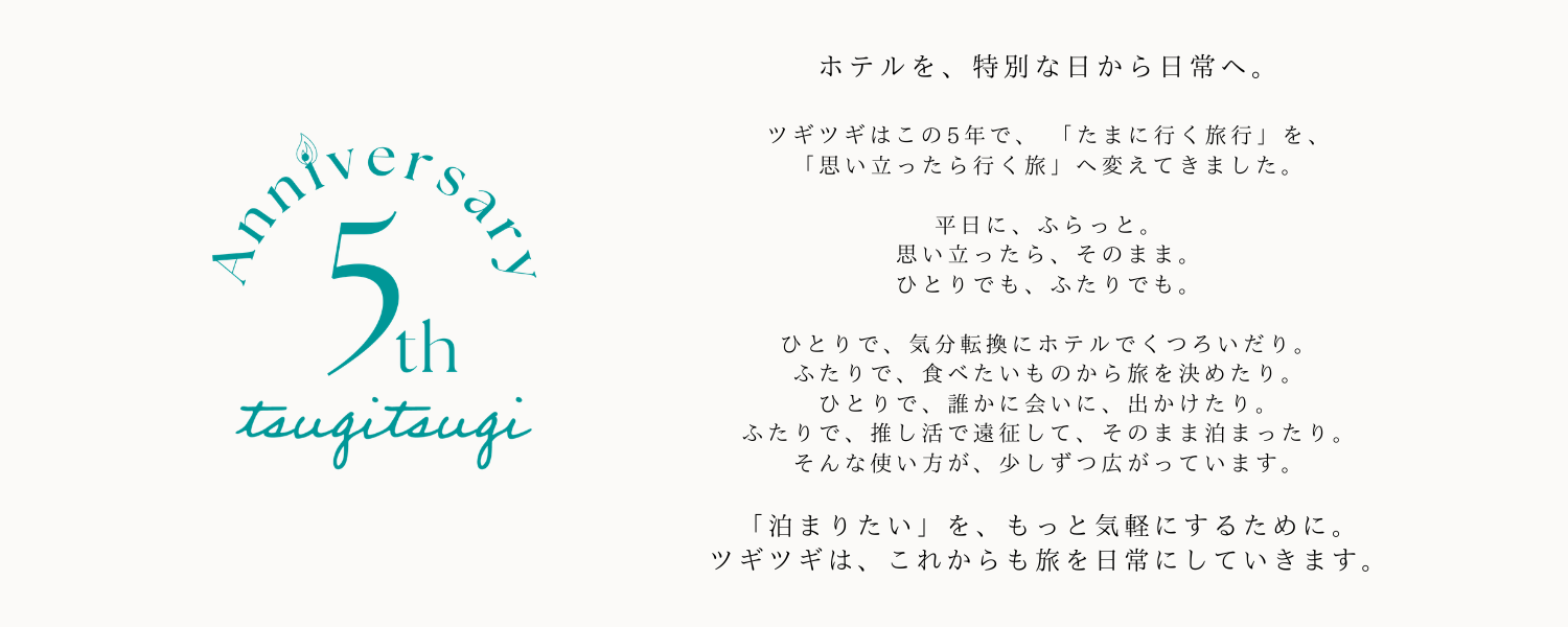 当社が提供する定額宿泊サービス「ツギツギ」(以下、本サービス)は、2026年4月5日(日)にサービス提供開始から5周年を迎えました。5周年を記念して、さまざまなおトクなキャンペーンを実施します。