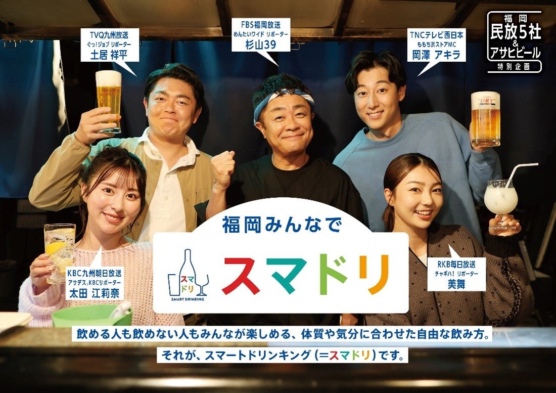 「スマドリ 福岡民放5局連動企画」篇は、FBS福岡放送・RKB毎日放送・TNCテレビ西日本・KBC九州朝日放送・TVQ九州放送の5局が「スマートドリンキング」の考え方に賛同したことで実現したCMです。各局の番組で活躍するタレントが出演し「スマートドリンキング」について一言ずつ紹介する様子を描いています。「飲めても飲めなくても、みんな飲みトモ。」というメッセージを通じて、お酒を飲める人と飲めない人が一緒に楽しめる世界観を訴求し「スマートドリンキング」の認知拡大を図ります。