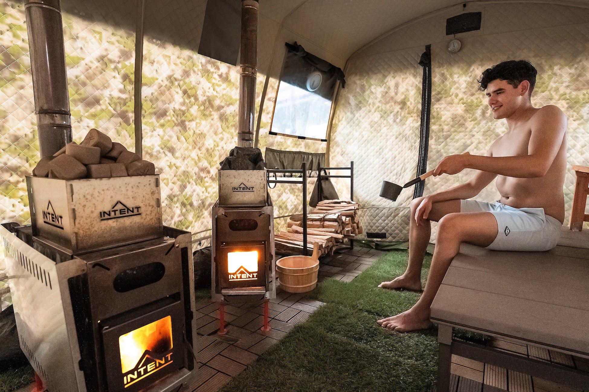 高密度の幕の内部に断熱材が⼊っており、外の冷気をシャットアウト、内部の熱も逃がさないキルティング素材「サーモスティック」を採用。熱テントのなかに薪ストーブを設置して、サウナストーンにアロマ水をかければ、100℃以上の体感になります。とにかく熱い蒸気浴を好むサウナ愛好家が絶賛する新鋭テントサウナブランド。