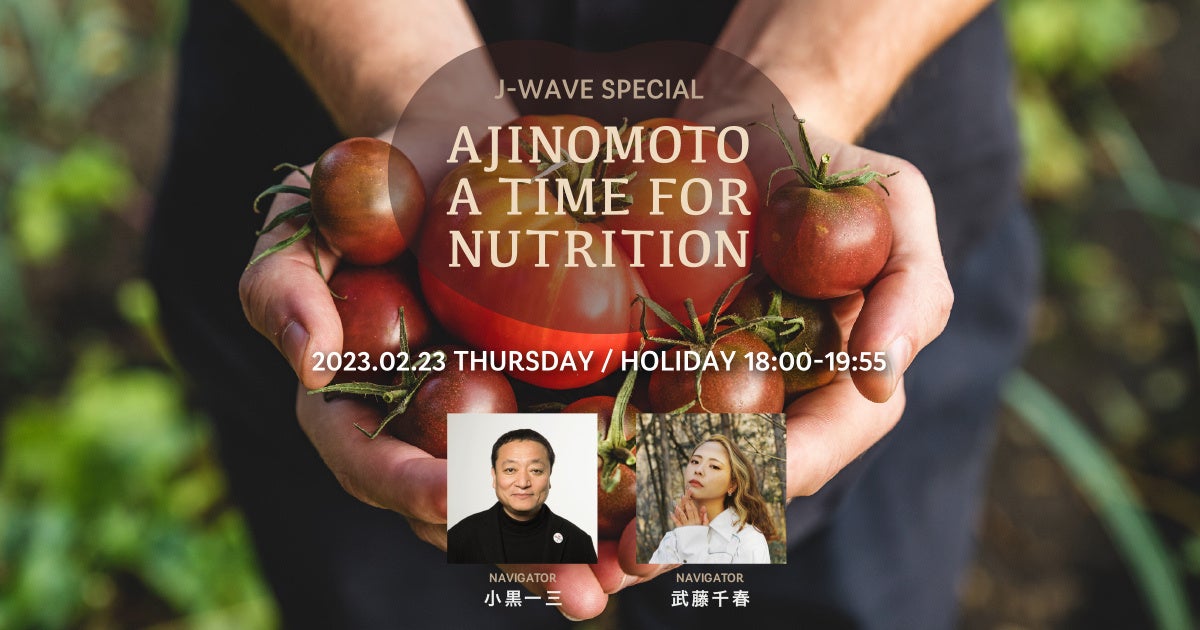 FMラジオ局J-WAVE(81.3FM)では、「天皇誕生日」の祝日である2月23日(木・祝)18:00〜19:55、「食と環境のサステナビリティ」をテーマに未来を考える約2時間の特別番組『J-WAVE SPECIAL AJINOMOTO A TIME FOR NUTRITION』をオンエアいたします。ナビゲーターは小黒一三と武藤千春。