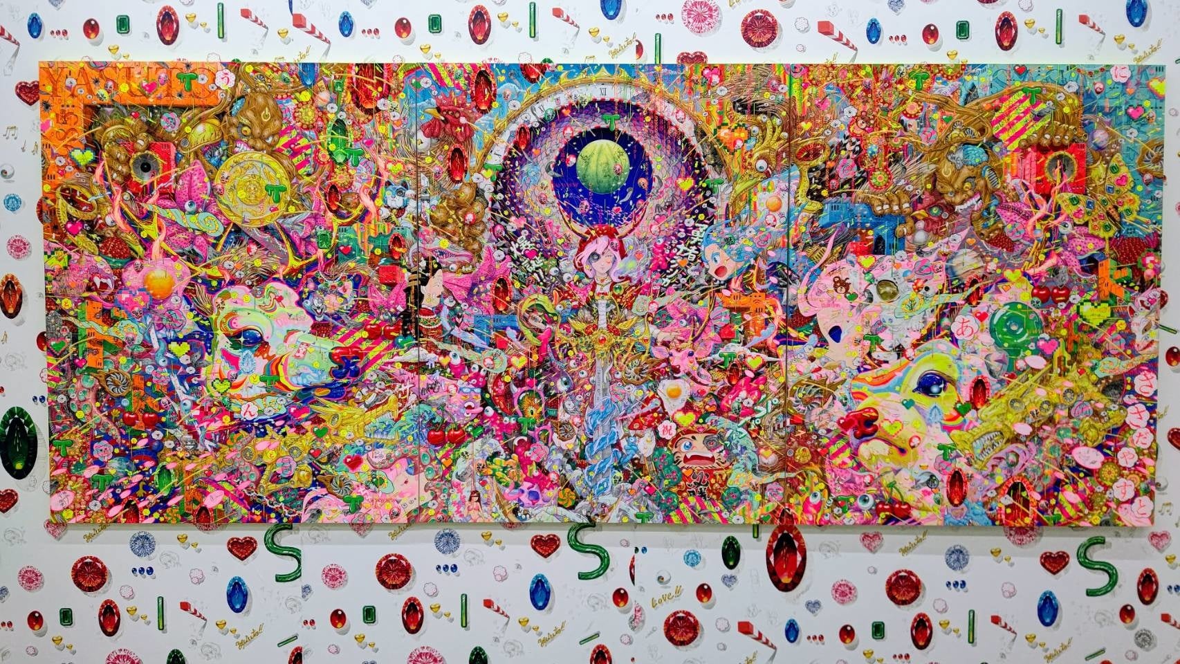 他にも今回初展示の作品があるとのことで、「100号のキャンバス3枚を使用した作品を展示しています。予想以上の大きさで最初は描けるかなと焦りましたが、急に個展で僕が発表している後ろで、代表作「ナラシカ」が「ナラシカちゃん」に擬人化し、剣を持ち守護神のように立っている画が浮かんだんです。色味までハッキリとしていたので、“寝ている場合じゃない!”と寝ずに描き上げたのが、「勇者ナラシカちゃん爆誕」になります」とのこと。今回はダイナミックがテーマだそうで、「これまでは小さいものをキャンパスに敷き詰める作風が多かったんですけど、パーツを大きく描くことを意識しました」と新たな試みにも挑戦。