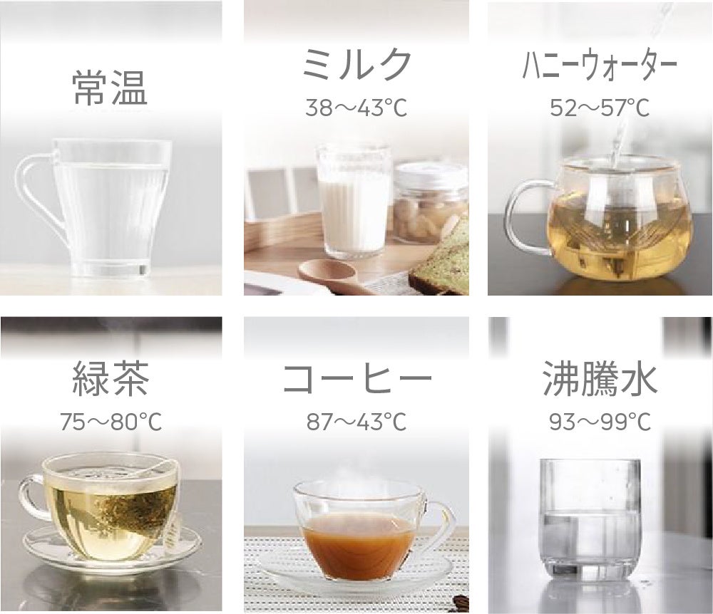 飲みやすい温度から、お茶やコーヒーに最適な温度、熱湯も自由自在。