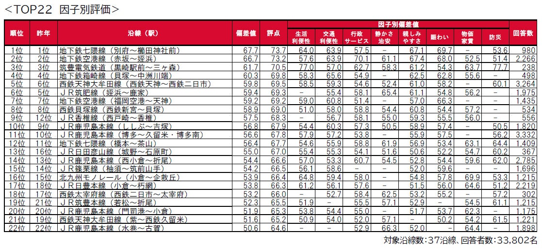 街の住みここち沿線ランキング2024<福岡県版> TOP22の因子別評価&順位