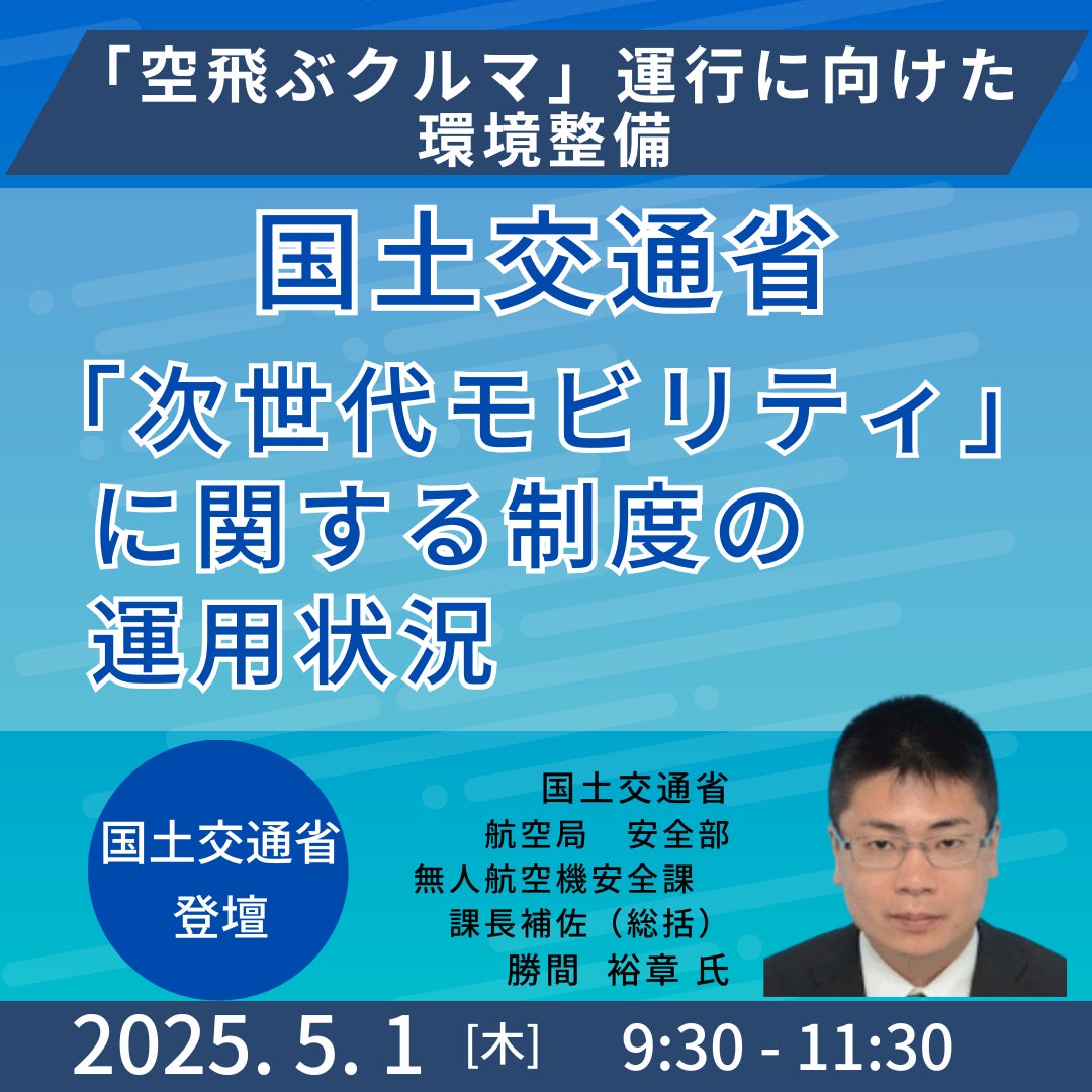 JPI(日本計画研究所)は、国土交通省 航空局 安全部 無人航空機安全課 課長補佐(総括) 勝間 裕章 氏を招聘し、「次世代モビリティ」に関する制度の運用状況と 「空飛ぶクルマ」の運行に向けた環境整備について詳説いただくセミナーを開催します。
