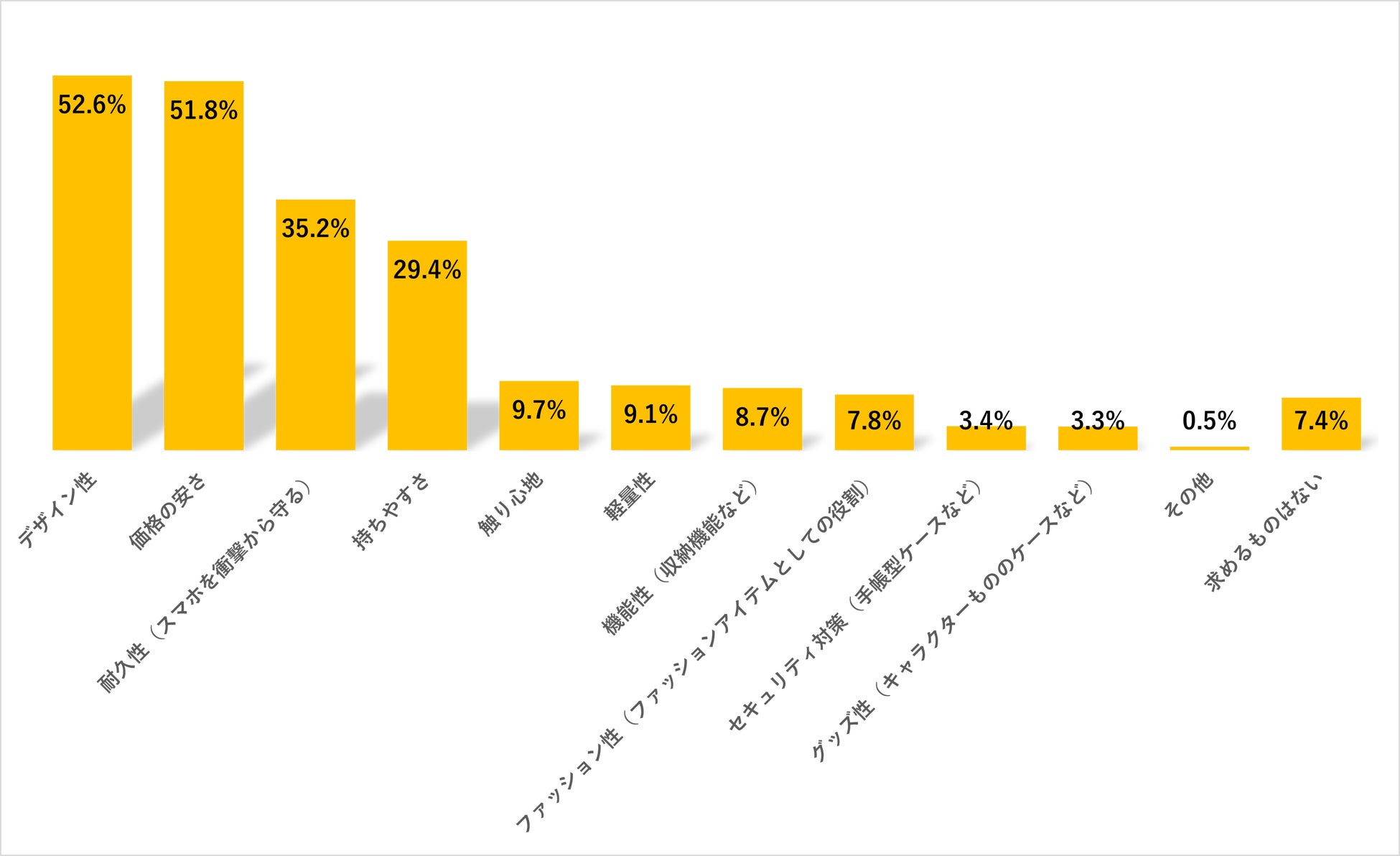 そのほか少数意見では"ファッション性"が7.8%・"グッズ性(キャラクター)"が3.3%など、趣味嗜好をスマホケースに求める回答もありました。