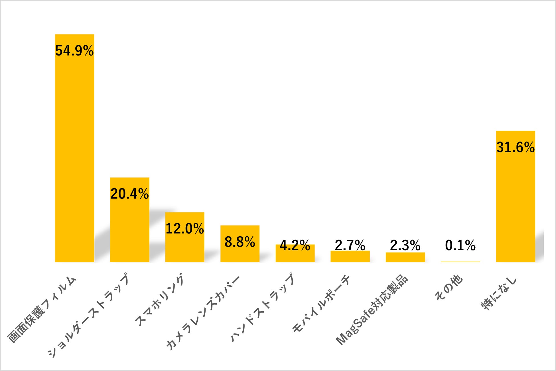 スマホケース以外で、現在使用しているモバイルアクセサリーは、【画面保護フィルム】が54.9%で1位、【ショルダーストラップ】が20.4%で2位、【スマホリング】が12%で3位となりました。