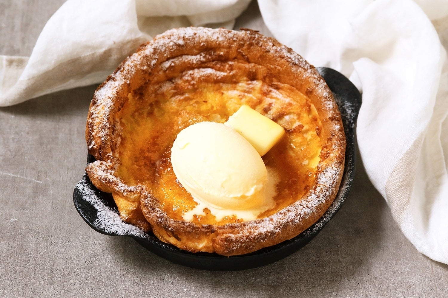 ダッチパンケーキをシンプルに。香りのよい発酵バターにメープルシロップとバニラアイスを合わせて。