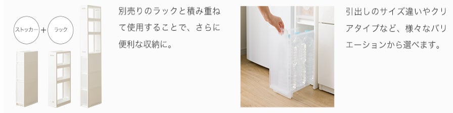 ニトリの隙間収納アイテムは、中身が見やすいクリア色と隠せるホワイト色の2色のカラーに加え、引き出しのサイズ・幅など豊富に取り揃えています。