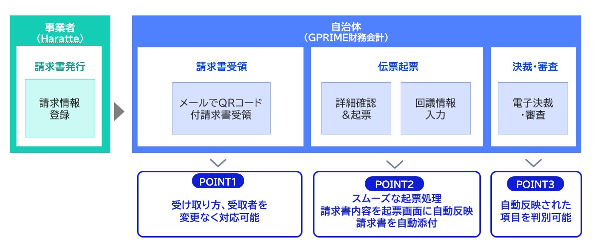 現在、多くの自治体では、受け取った請求データを財務会計システムへ手入力する作業が依然として職員の負担となっています。また、手入力に伴う転記ミスや、それに伴う審査の差し戻しといった課題も発生しています。 これらの課題を解決するため、基幹業務を支える「GPRIME財務会計」と、電子請求のフロントエンドを担う「Haratte」のデータ連携を行うこととしました。