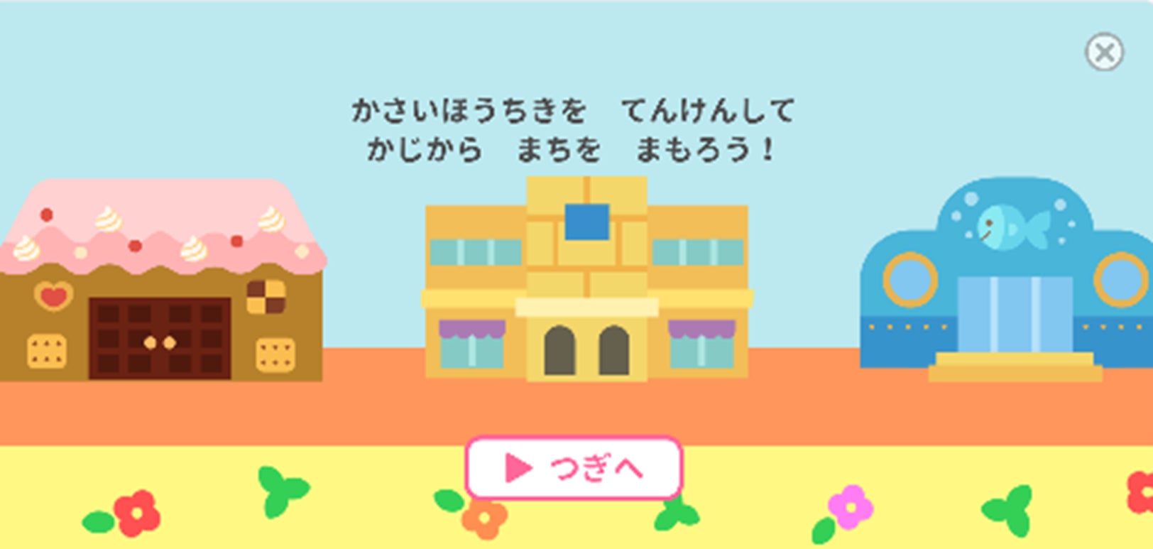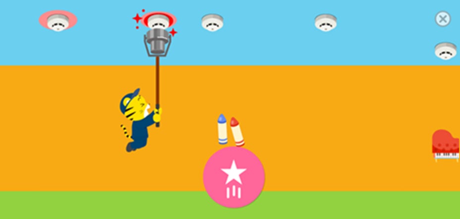 しまじろうが消防設備士になり、水族館やスイーツショップなど、身近な施設や建物の火災報知機の点検を行います。流れてくる感知器にタイミングを合わせてジャンプをし、点検をすることでゲームを進めます。