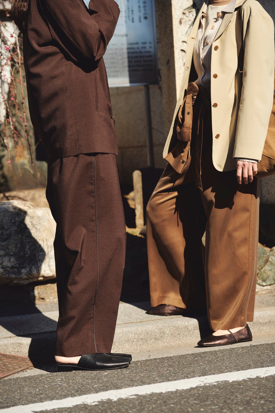 前ボタンを全て閉じることで1枚でも美しく着こなせるジャケットは、同素材で仕立てたパンツと合わせることで、まるでパジャマセットアップのような肩の力を抜いたムードに。きちんと感とリラックス感を両立させた、今季ならではのバランスをお楽しみいただけます。