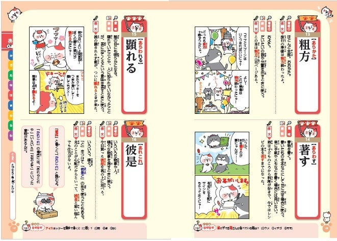 2コママンガやイラストを豊富に用いた「オールカラー紙面」で、言葉の意味や由来、使い方をやさしく学べます。また、すべての漢字に「ふりがな」つきなので、漢字が苦手な小学生もしっかり学べます。このほか、ことわざ、四字熟語などの「漢字のなぞなぞ」、動物や魚、昆虫、食べ物などジャンルごとに収録した「難読漢字一覧」つき。プラスの知識も身につきます。