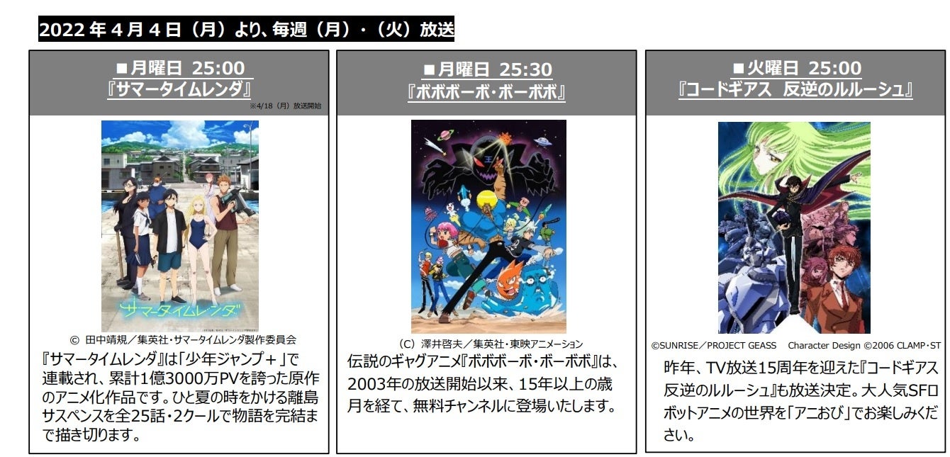 「アニおび」枠は、新作や過去の名作など多彩なジャンルのアニメ作品を選りすぐってお届けする深夜編成枠で、4月より放送曜日、時刻が月・火曜日の25時からとなります。
