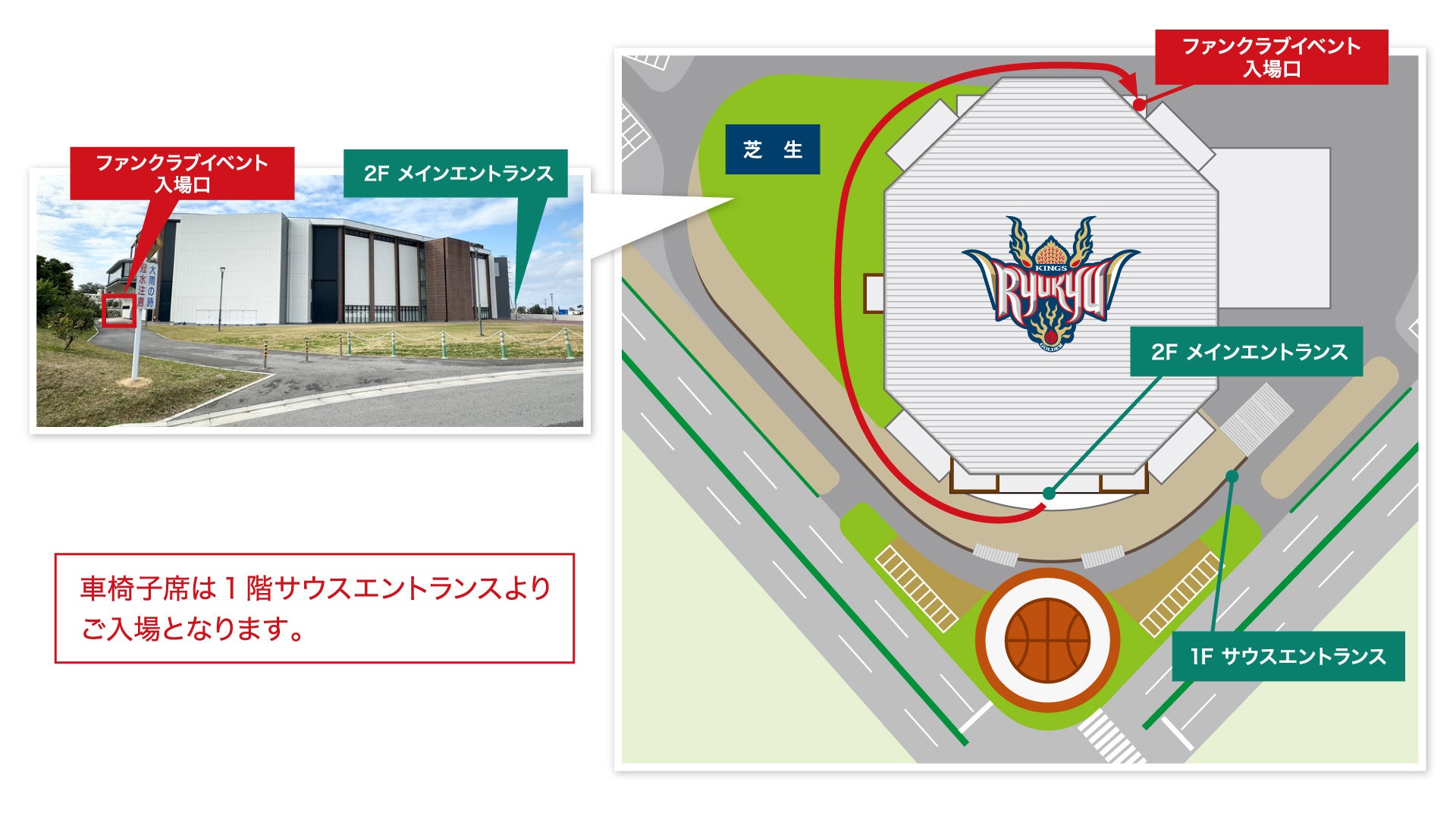 キングスホームゲーム時の入場口と異なり、沖縄サントリーアリーナ裏手の芝生エリア奥よりご入場いただきます。また、待機列もそちらへ設置予定ですので、予めご確認ください。詳細は以下をご参照ください。