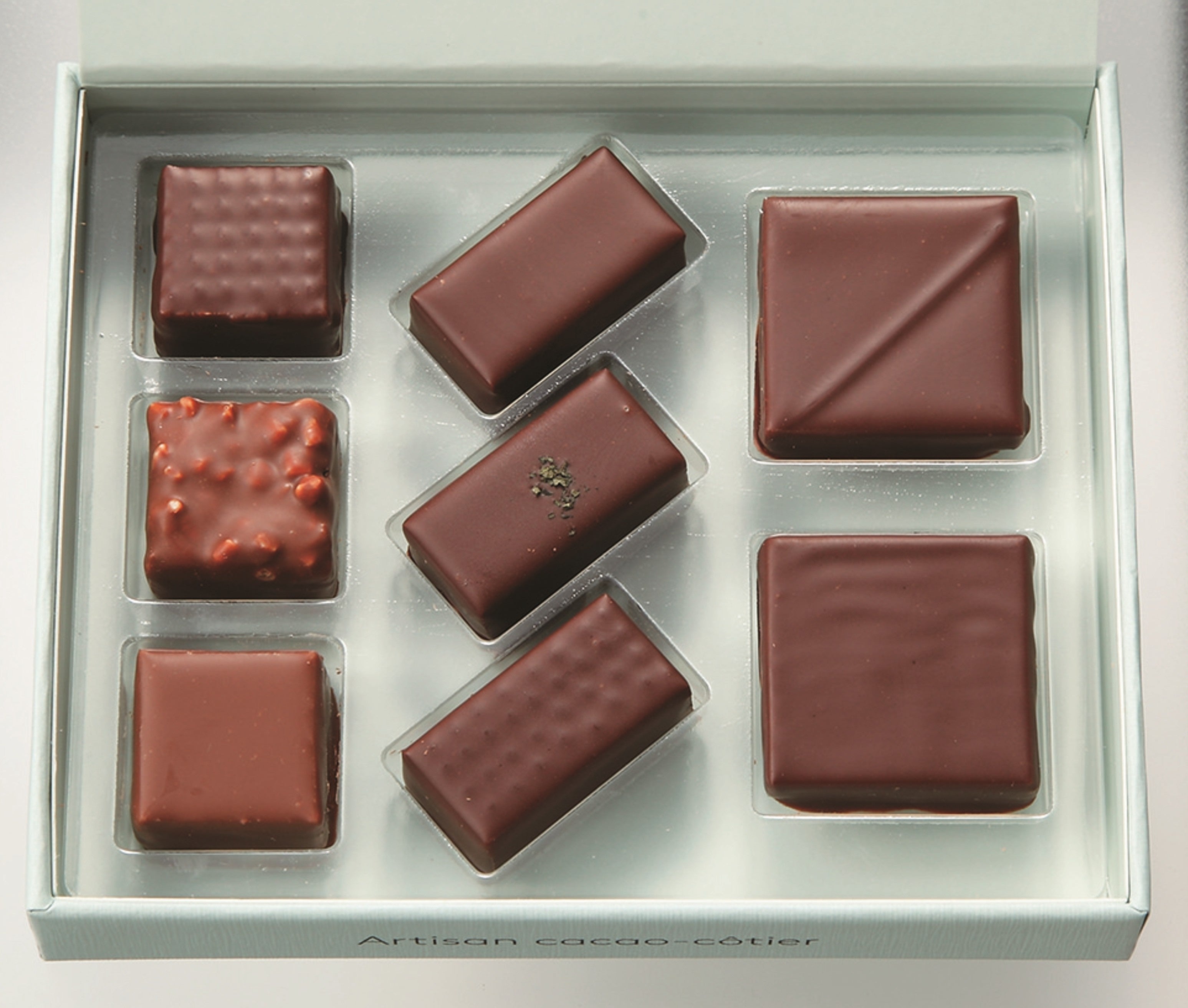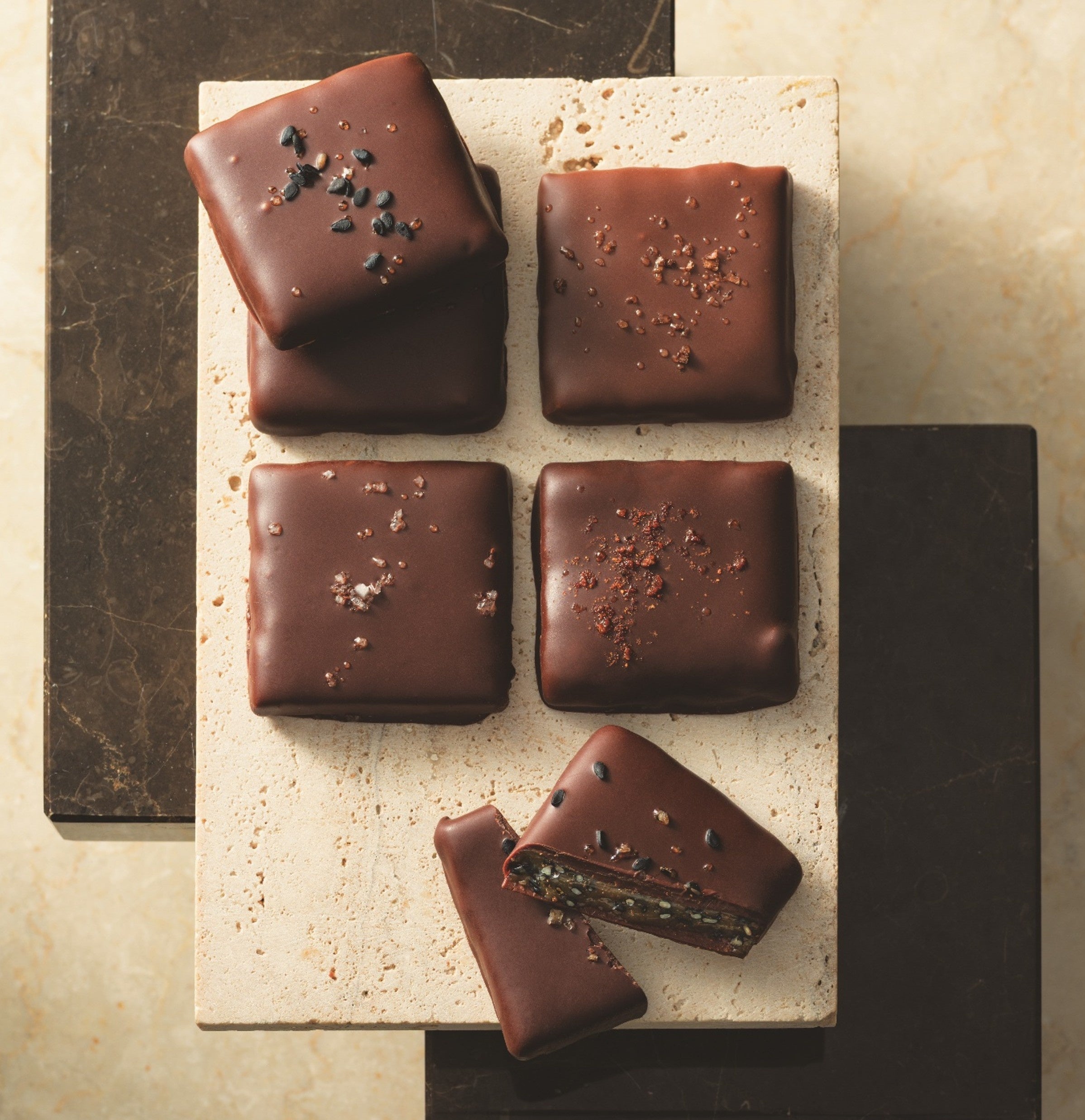 アルチザンの真髄を感じる、珠玉のコレクション。1粒ごとに丁寧な技とこだわりを詰め込んだ贅沢なアソート。マカダミアナッツのプラリネで塩バターキャラメルを挟んでローストアーモンドをまぶし、
