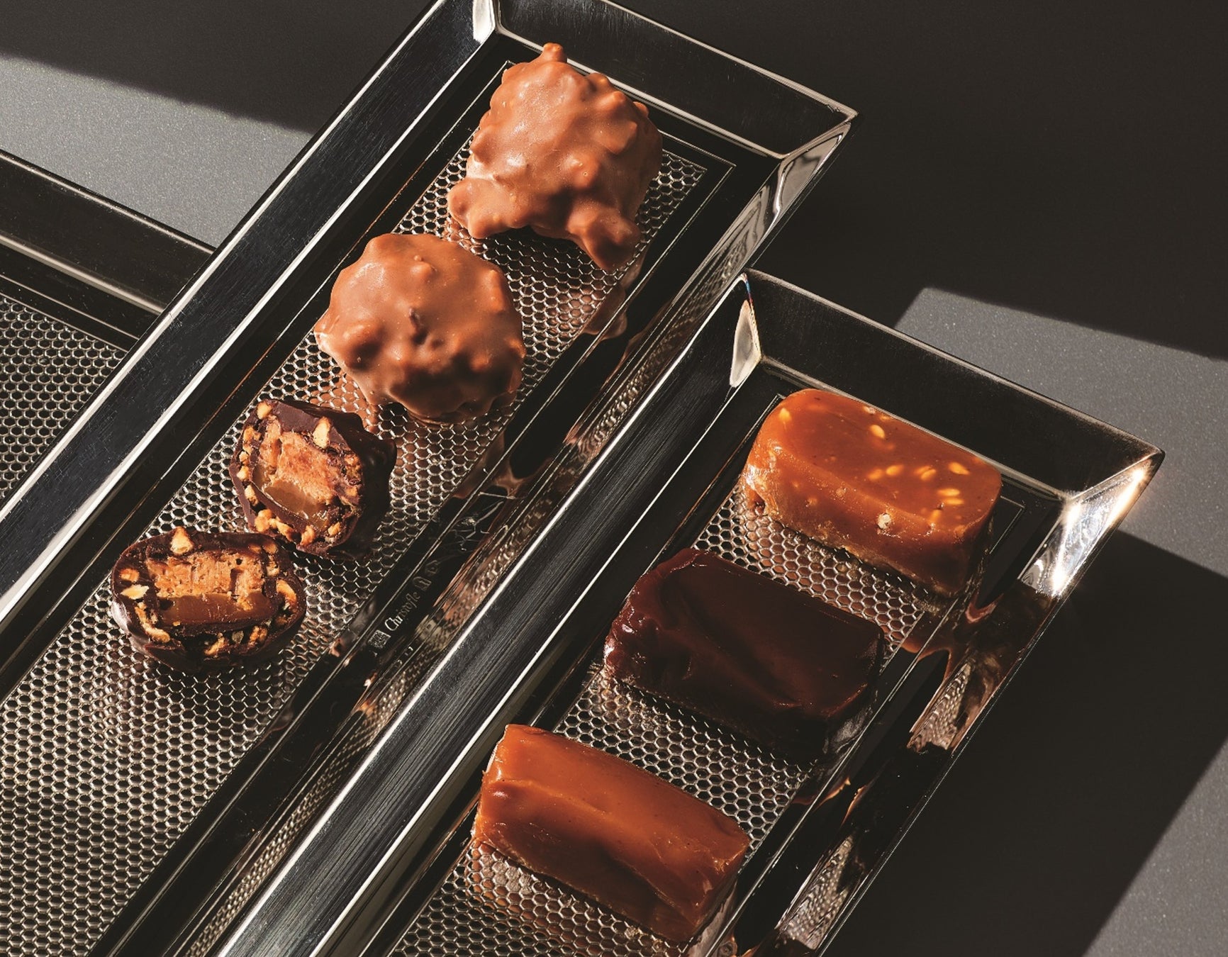 チョコレートでコーティングした「マカダミアプラリネキャラメル」2種と、なめらかで濃厚なコクと繊細な甘さが調和したキャラメル3種をセレクト。