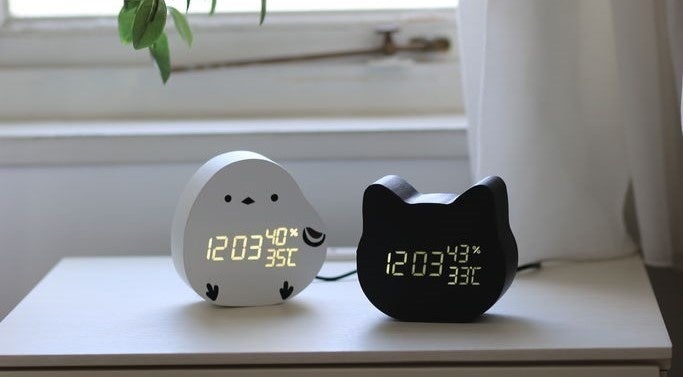 また、音や振動に反応して数字が表示される省エネモード(省電力モード)も搭載しました。就寝時など、光を発生させたくないときにおすすめです。時間が表示されていないときは、かわいい置物として暮らしに寄り添います。窓辺に置くと、まるでデコネコやシマエナガが遊びに来たかのような癒しの空間になります。