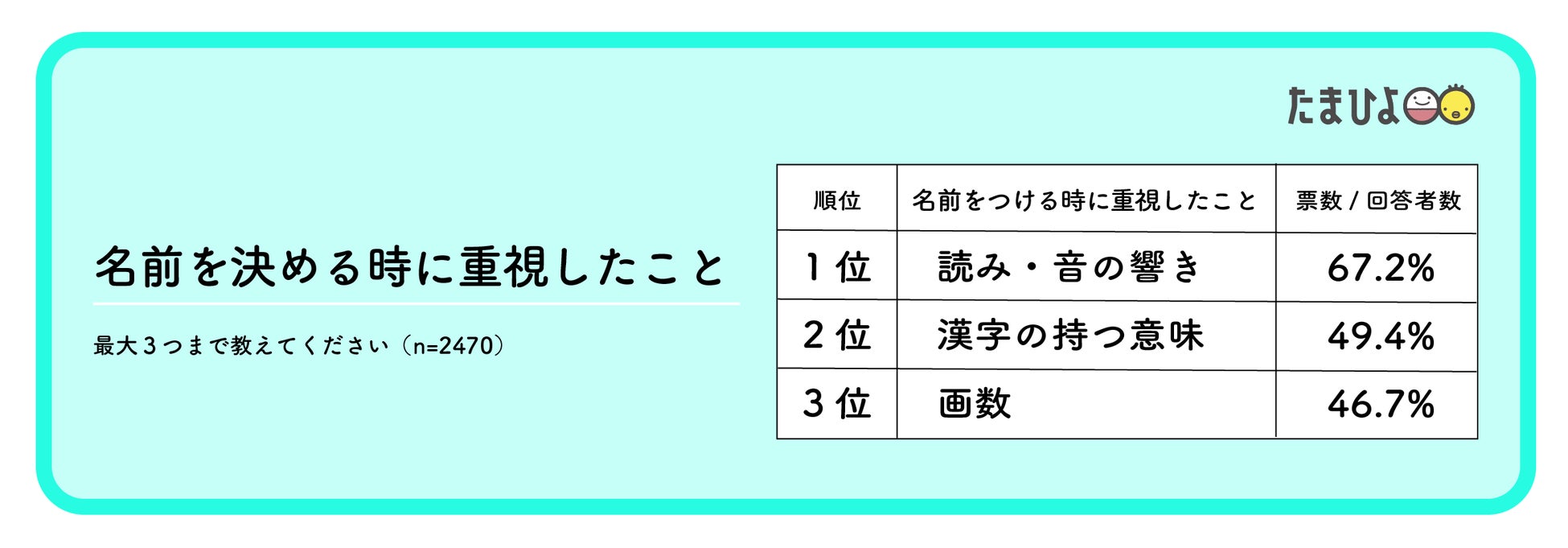 昨年は1位「読み・音の響き」2位「画数」3位「漢字の持つ意味」だったところ、今年は2位と3位が入れ替わりました。「読み・音の響き」が名づけで最も重視する項目であることは変わらず、1文字名前が増えているなか「漢字の持つ意味」も重視して名づけをする傾向が見られました。