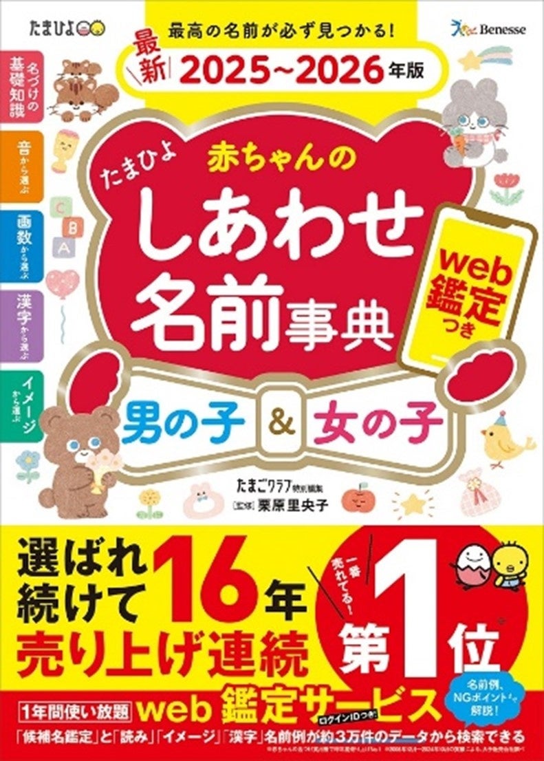 2024年の人気名前ランキングを100位まで掲載。名づけの注意点や出生届の書き方・出し方など名づけに関する基礎知識を丁寧に解説するほか、豊富な名前実例を画数別、読み別、イメージ別など、検索しやすい章立てで紹介しています。また、「Web鑑定サービスログインID」がとじ込まれており、パソコン・スマートフォンから、候補の名前の鑑定や「読み」「イメージ」「漢字」から姓に合った良運の名前を検索できます。