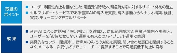そしてこの度、日本語でのハイブリッド運用対応スキームが継続評価を得たことから、国内で初めて音声AIの英語版を導入しました。日本語版の構築からチューニングを実施してきたノウハウを英語版に転用することで、構築期間も大幅に短縮しております。