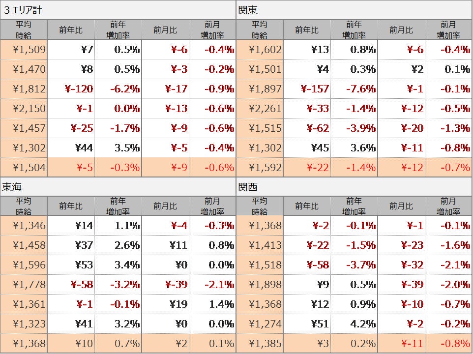 エリア別の平均時給について、関東エリアは1,592円(前年同月比-22円、前月比-12円)、東海エリアは1,368円(前年同月比+10円、前月比+2円)、関西エリアは1,385円(前年同月比+3円、前月比-11円)となりました。