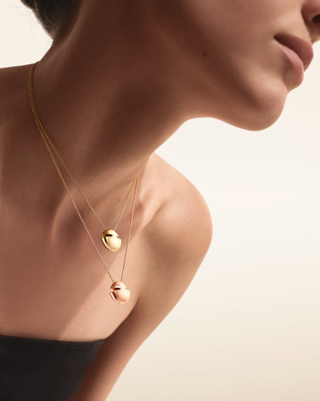 ゴールドの雫から生まれる純粋で本質的な形の数々。光と影の官能的なダンスの中で繰り広げられる、肌と金属、形と物質、人とモノの触れ合い。なめらかなゴールドの表面を流れる高貴な輝きが、物質をダイナミックに、まるで液体のように流動的に生き生きとさせます。「ブルガリ カボション」コレクションは、煌びやかなイエローゴールドとピンクゴールドのジュエリークリエイションに包まれた触覚的な体験を視覚的に浸りながら、その力強いグラフィックとインパクトある美しさが、絶え間ない発見と純粋な喜びの旅へと誘います。