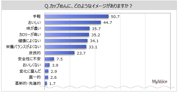 【カップめんに関する調査】カップめんのイメージは「手軽」が5割強、「おいしい」が約45%、「味が濃い」「カロリーが高い」「健康によくない」「栄養バランスがよくない」が各30%台