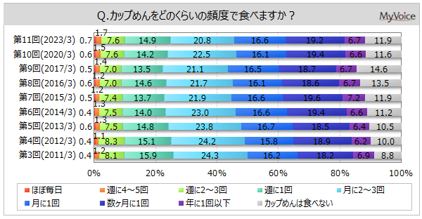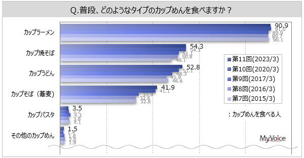 マイボイスコム株式会社(東京都千代田区、代表取締役社長:高井和久)は、11回目となる『カップめん』に関するインターネット調査を2023年3月1日~5日に実施しました。調査結果をお知らせします。