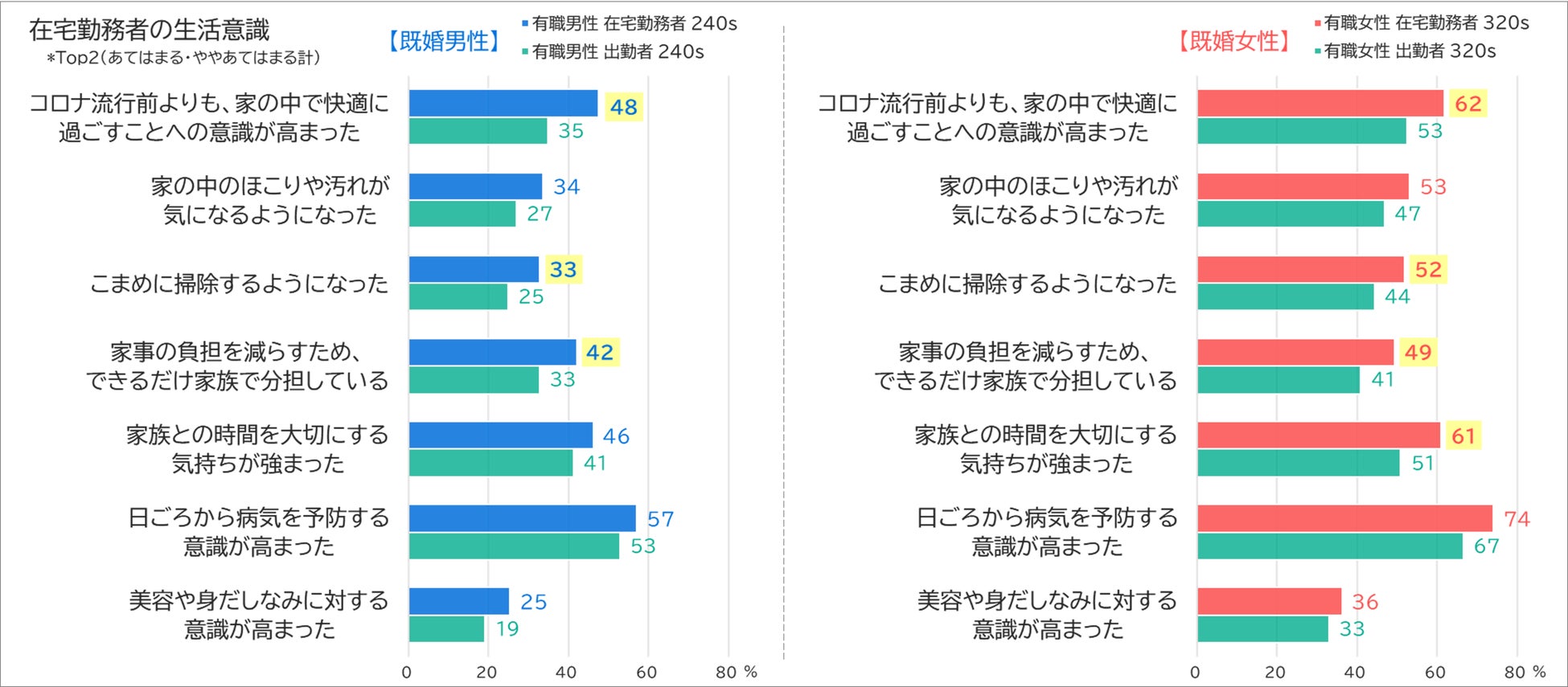 その結果、「在宅勤務者の生活実態」に関して、男女共に「コロナ流行前よりも、家の中で快適に過ごすことへの意識が高まった」「こまめに掃除するようになった」など、在宅勤務者は出勤者に比べて掃除に対する意識が高まっていることが分かりました。