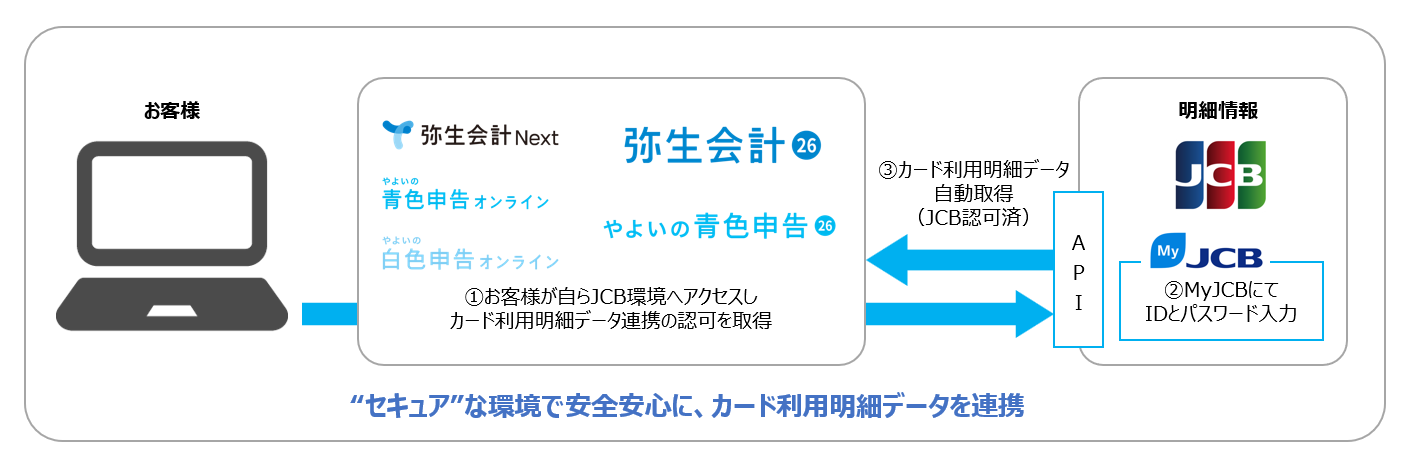 JCBは、弥生が提供するサービスと従来よりカード利用明細データのAPI連携を行っており、JCBカード会員様の同意を得たうえで、JCBカードの利用明細の自動連携および自動仕訳を実現しております。