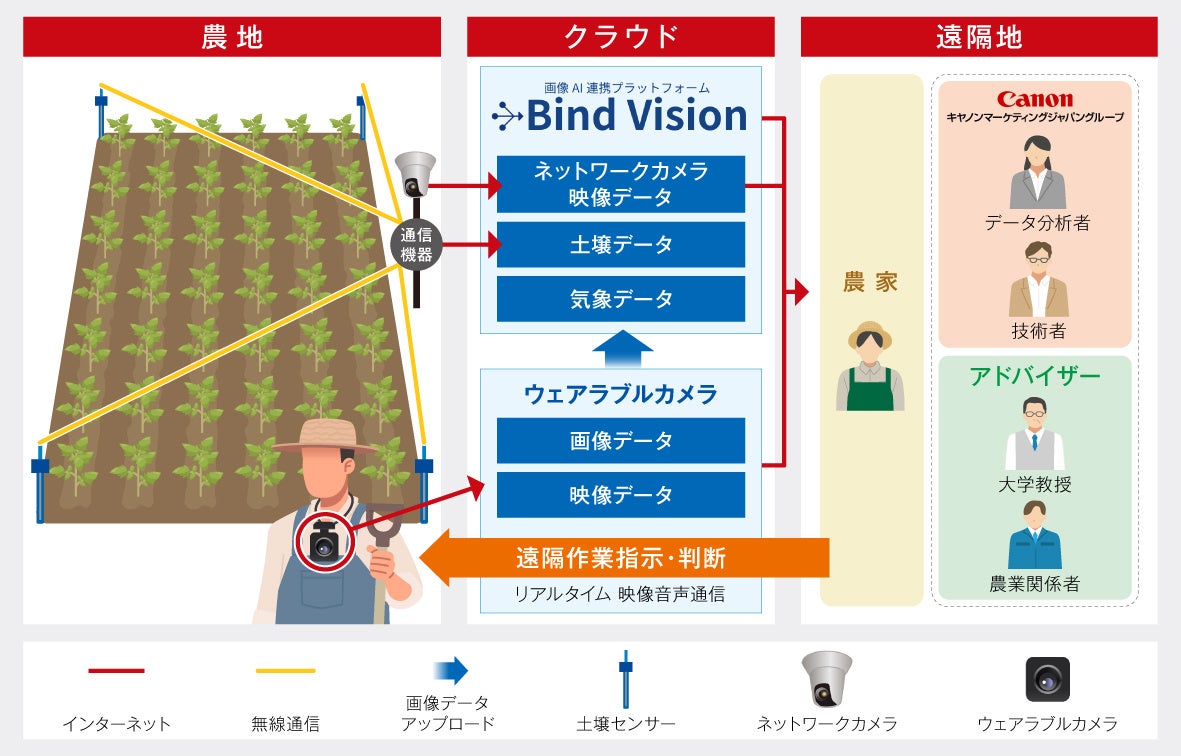 愛媛県内の2か所の農家で、バラ・里芋の露地栽培、トマトのハウス栽培を対象に、映像・気象・土壌データをキヤノンITSの画像AI連携プラットフォーム「Bind Vision(バインドビジョン)」で可視化・蓄積します。高画質な映像や画像により、遠隔地からでも農地や農作物の状況をリアルタイムで把握し、気象・土壌データなどの環境データの推移と組み合わせることで、育成状況に関するデータの振り返りを可能にします。また、ウェアラブルカメラを活用し、現場の映像や音声を共有しコミュニケーションを取ることで、遠隔地からの状況判断や作業指示を支援します。これにより生産業務の効率化に加え、データの可視化を通じた技術継承や作業の平準化を支援し、農作物の品質向上と収量増加の促進を実証します。