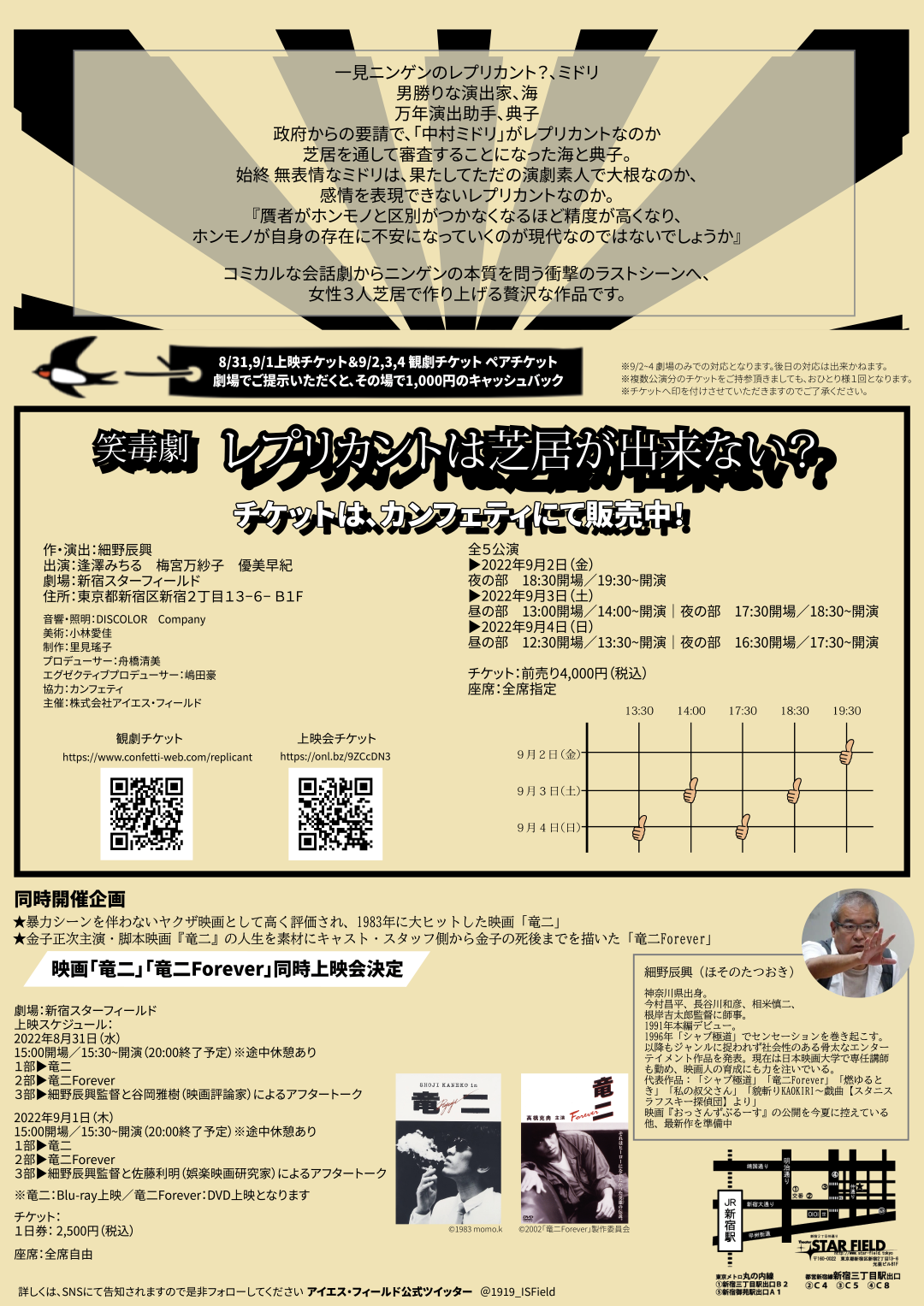 映画「竜二」と「竜二Forever」、舞台「レプリカントは芝居出来ない?」の世界感を味わい、忙しい日常を忘れられるイベントになること必至である!
