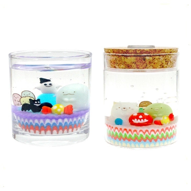 グラスの中に色鮮やかな砂を敷きつめて、ハロウィーンのモチーフやお気に入りのすみっコキャラクターを並べて、世界に一つだけのキャンドルを作ります。