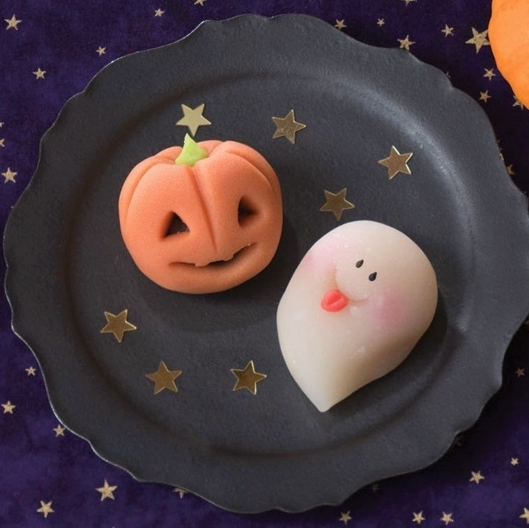 にやりと笑うパンプキン(かぼちゃ)と、ピンクのほっぺが愛らしいゴースト(おばけ)の期間限定生菓子。