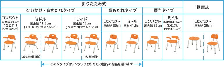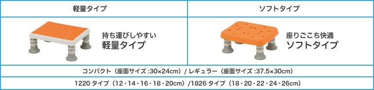体格やシーンにあう幅広い品揃え。椅子の素材は冷たさを感じにくく、すべりにくい仕様で、水切れもよく着脱も簡単です。