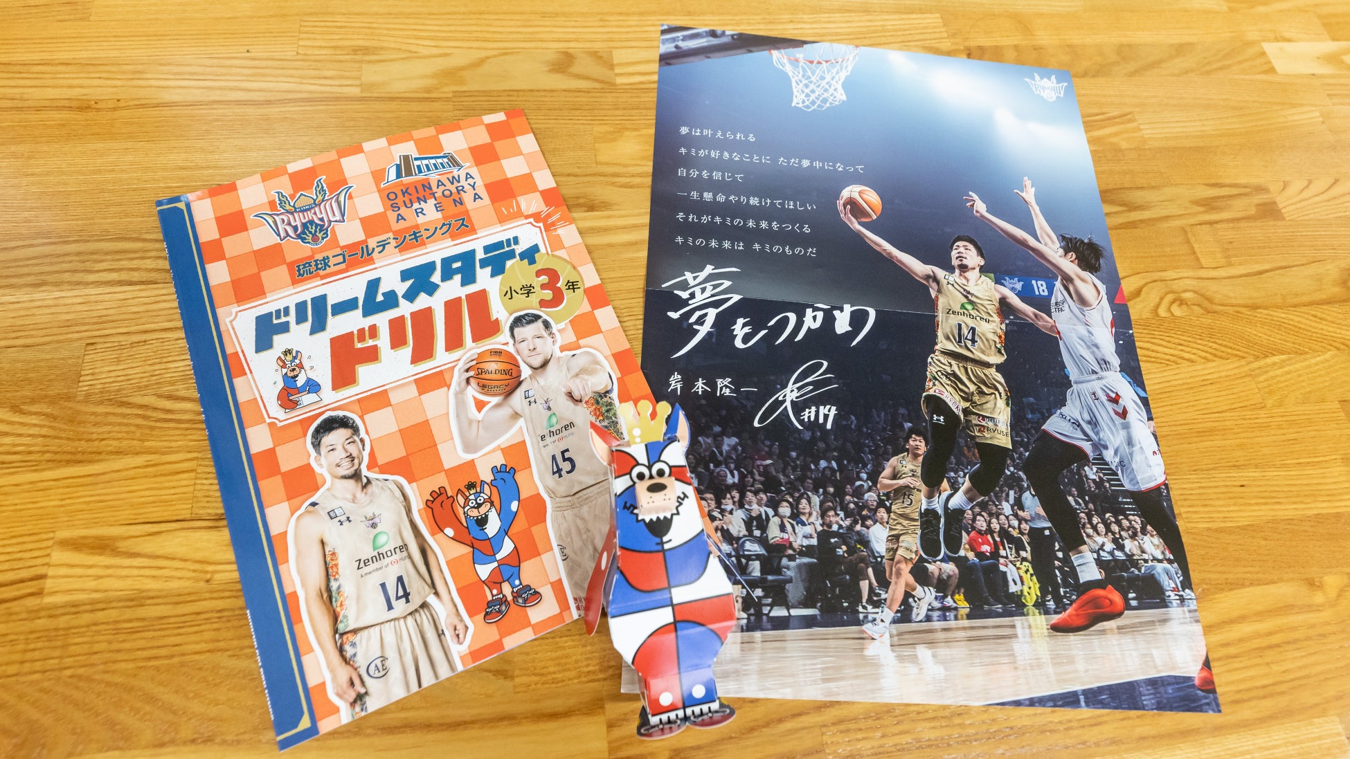 ドリームスタディドリルには、キングスの選手やマスコットの「ゴーディー」が登場し、沖縄市の名産品や伝統芸能であるエイサーなど、子どもたちが暮らす地域への関心を深めながら、身近な話題を通じて楽しく学べる内容となっています。また、国語や算数といった教科の学習に加え、#14 岸本隆一選手の「夢をつかめ」というメッセージが込められたポスターや、ゴーディーのペーパークラフト貯金箱も教材の付録として付いています。