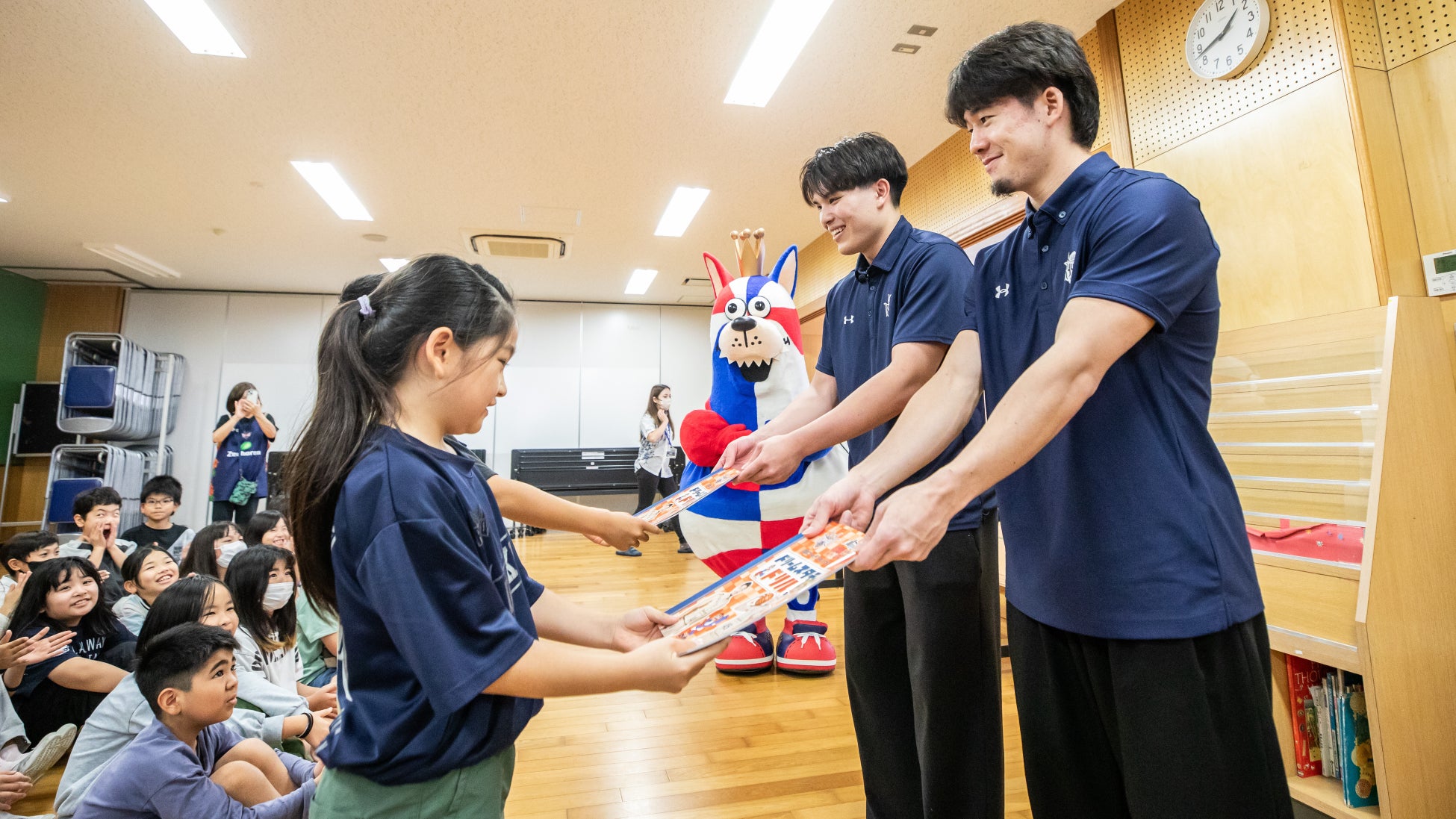 また、同日に#2 小針幸也選手、#17 崎濱秀斗選手、マスコットのゴーディーが沖縄市立中の町小学校を訪問しました。児童にドリームスタディドリルを手渡し、子どもたちとの交流を深めました。
