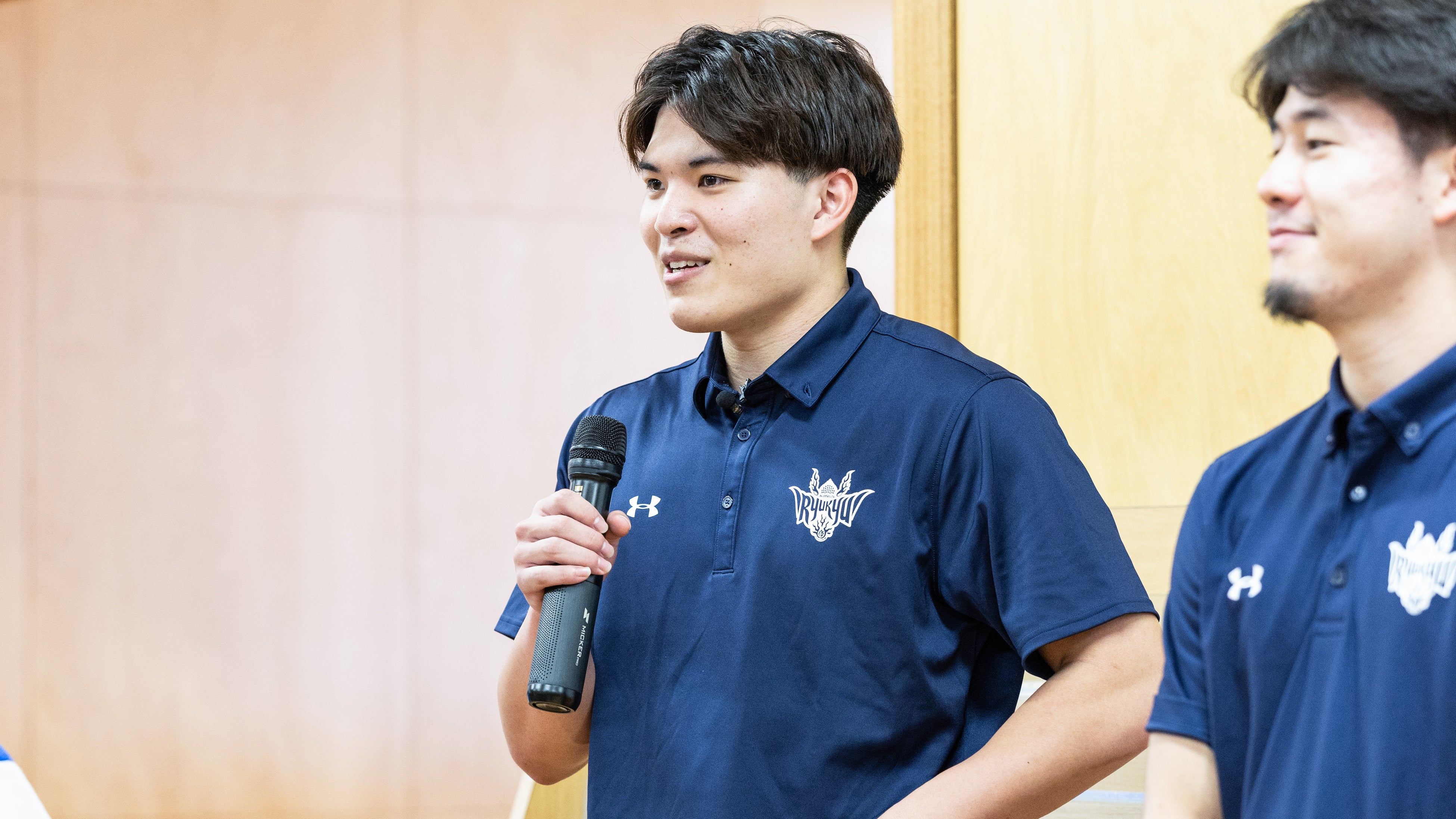 プロバスケットボール選手となって6年目になりますが、キングスに来て、この沖縄市ほど街全体でプロスポーツが盛り上がっていると感じる場所はありません。その熱量を肌で感じながらプレーできることを、とても幸せに思っています。今回贈呈したドリルやバスケットボールを通して、未来を担う子どもたちに、よりポジティブなエネルギーを届けていきたいです。これからも皆さんに元気を届けられるよう、精一杯頑張ります。引き続き応援をよろしくお願いいたします
