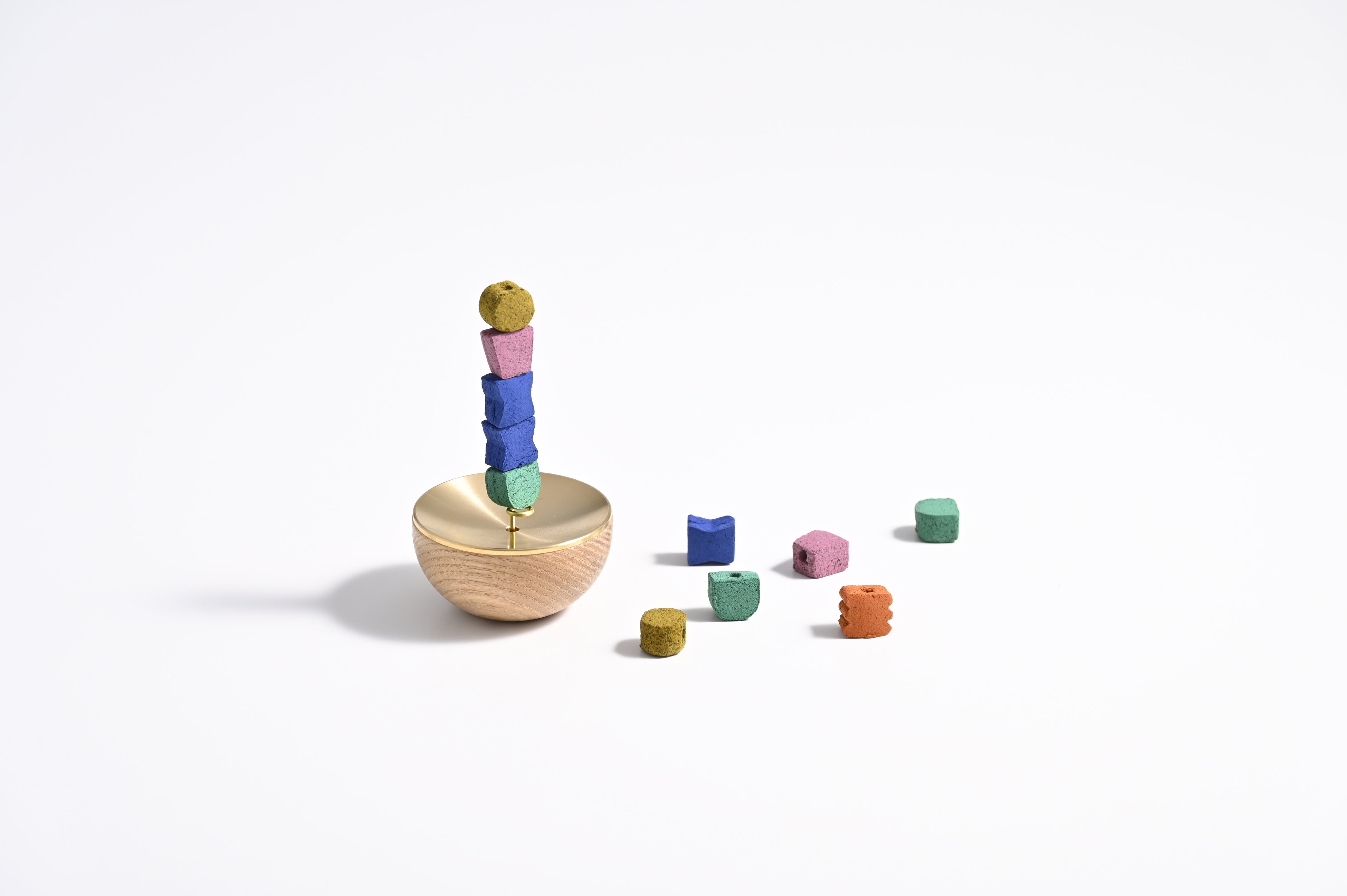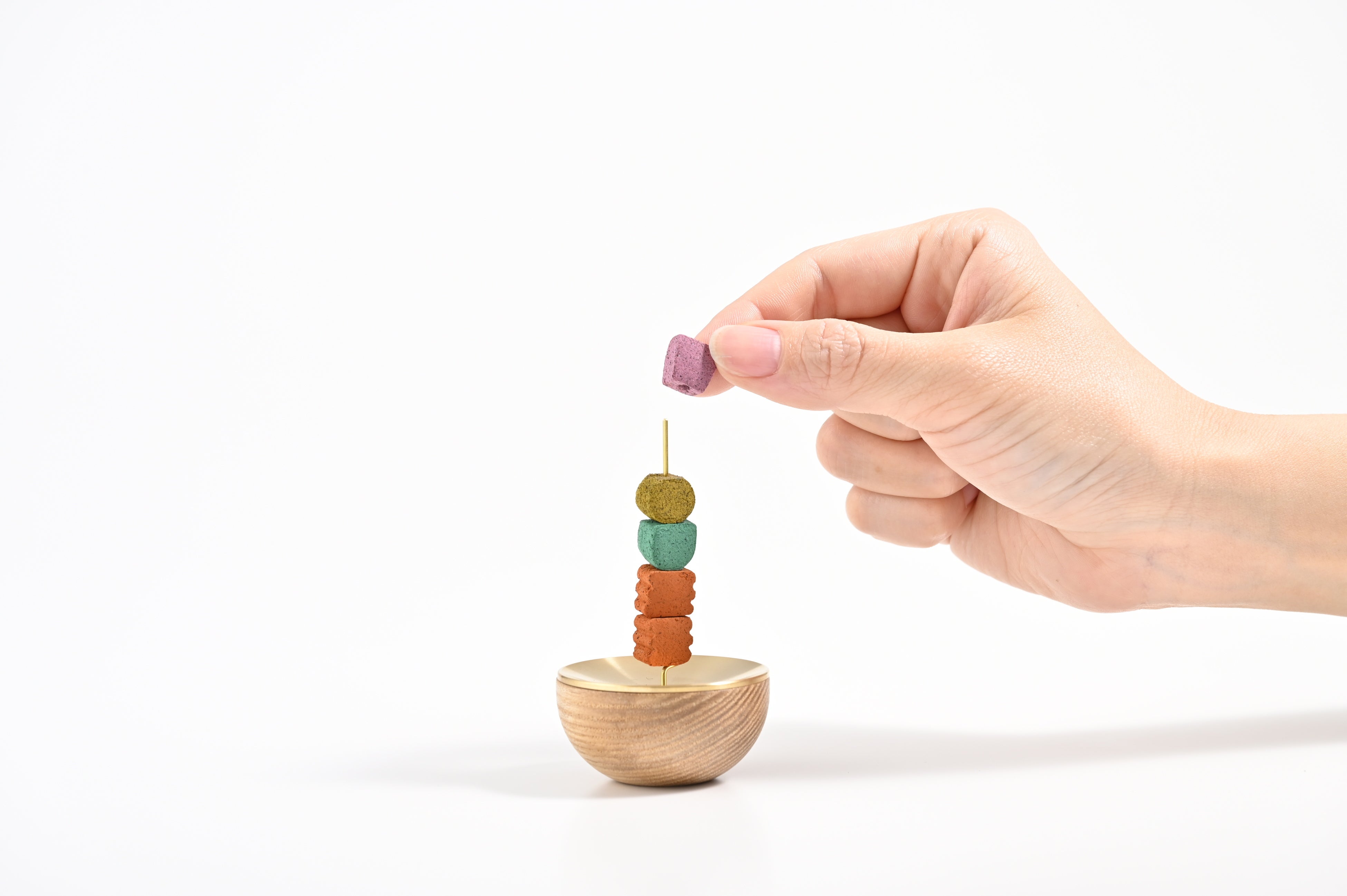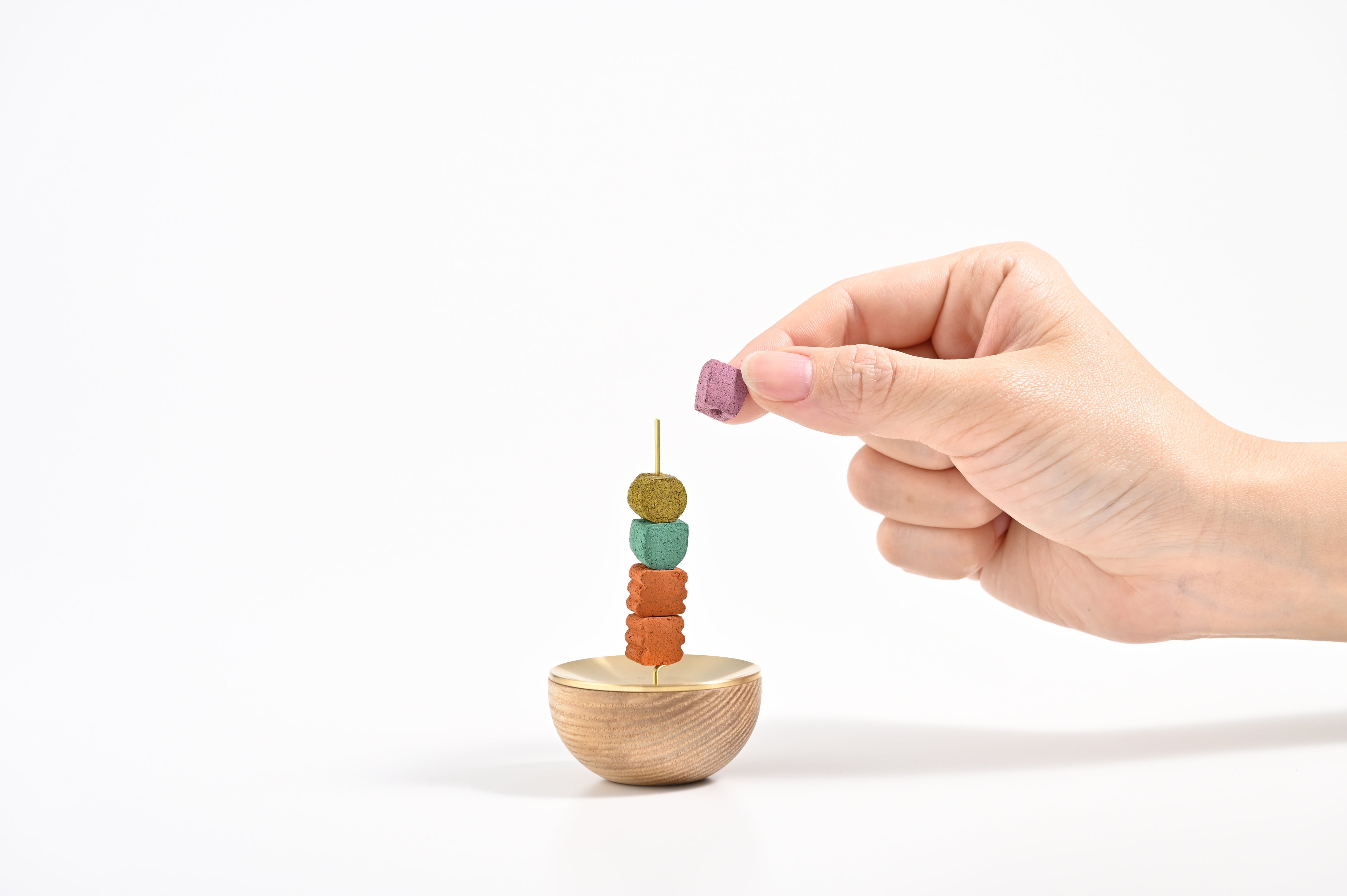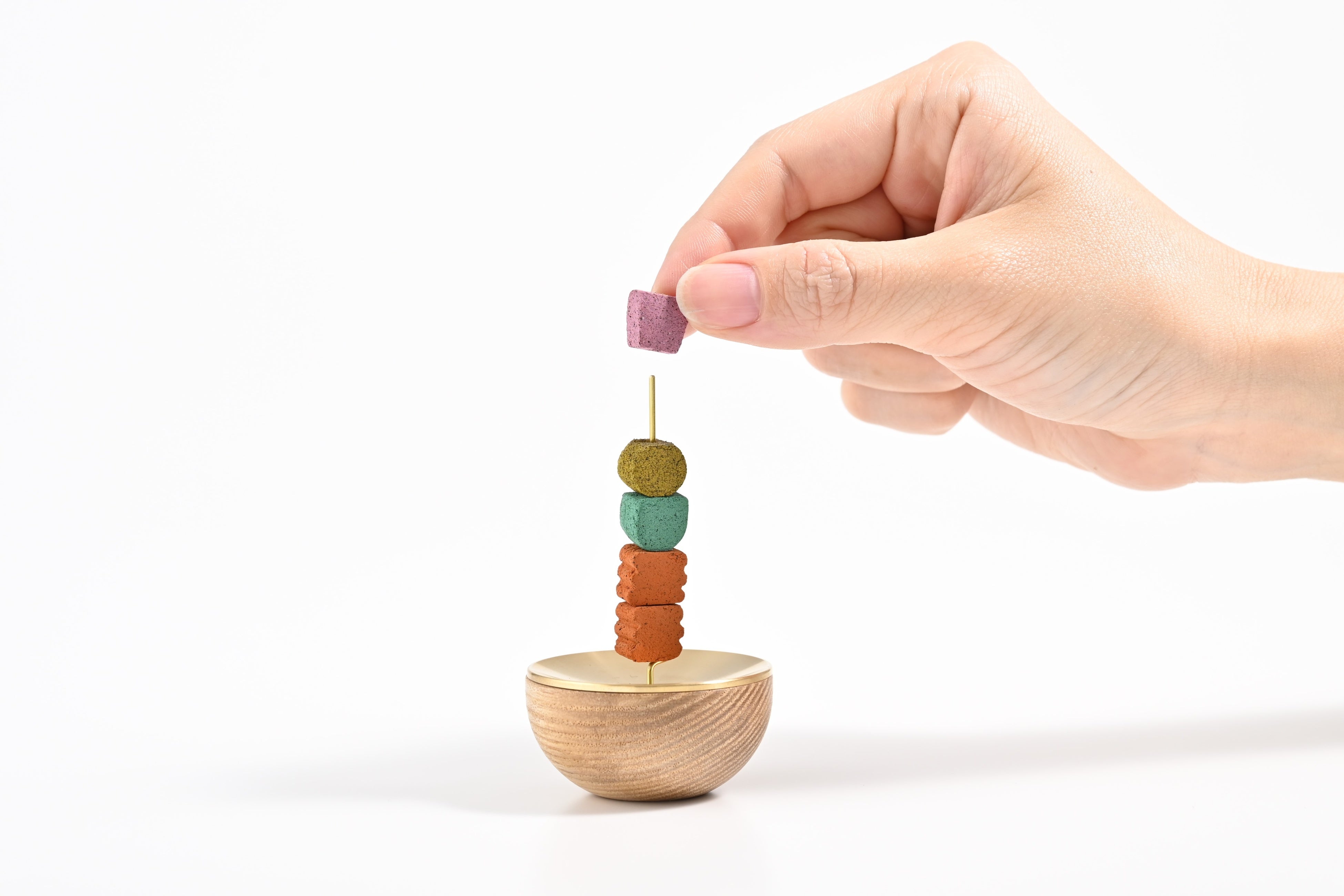 気分に合わせて、香りや色が異なるお香を最大5つまで積み上げることができます。天辺に火を灯せば、ブロックが燃え進むごとに香りが変化し、嗅覚を通じて「時の移ろい」をやさしく伝えます。