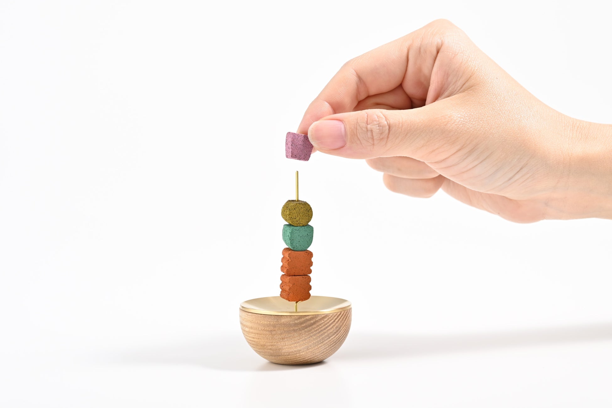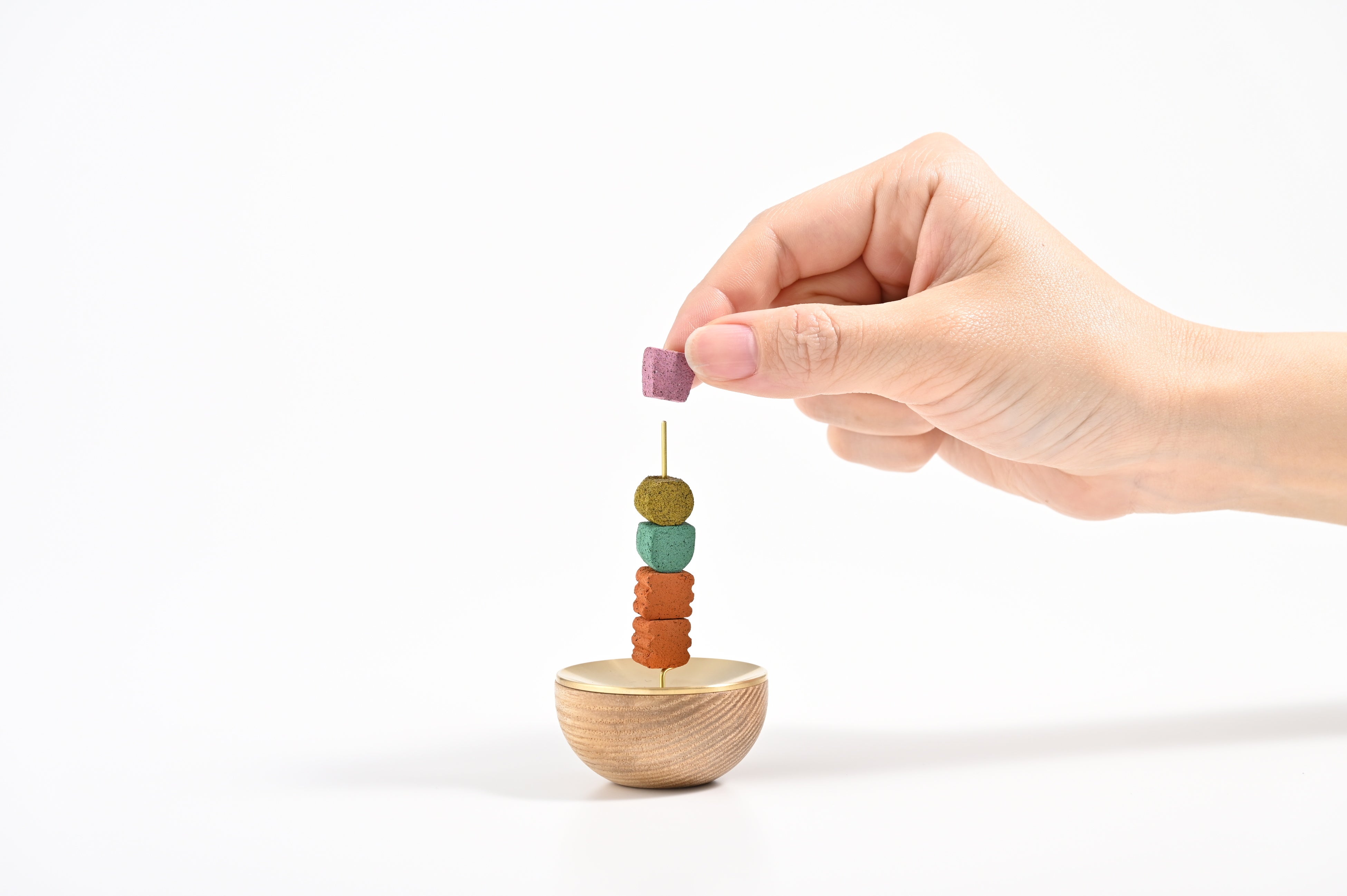 今回の商品化にあたり、松栄堂が培ってきた伝統の調香・成型技術との融合を図りました。お香ブロックの繊細な形状や、時間経過による鮮やかな香りの切り替えは、卓越した熟練の技によって実現しています。コクヨのデザインと松栄堂の伝統技術を掛け合わせることで、現代における新しい香りの体験を形にしました。