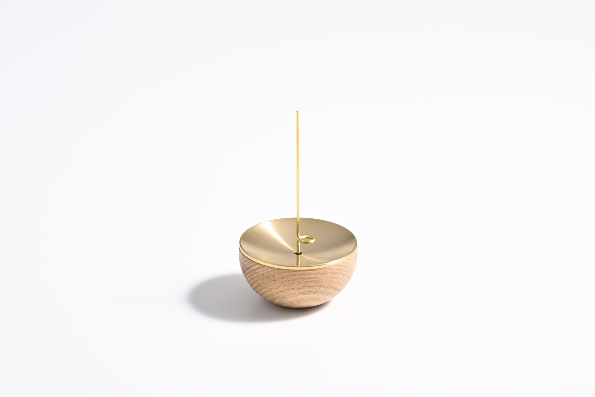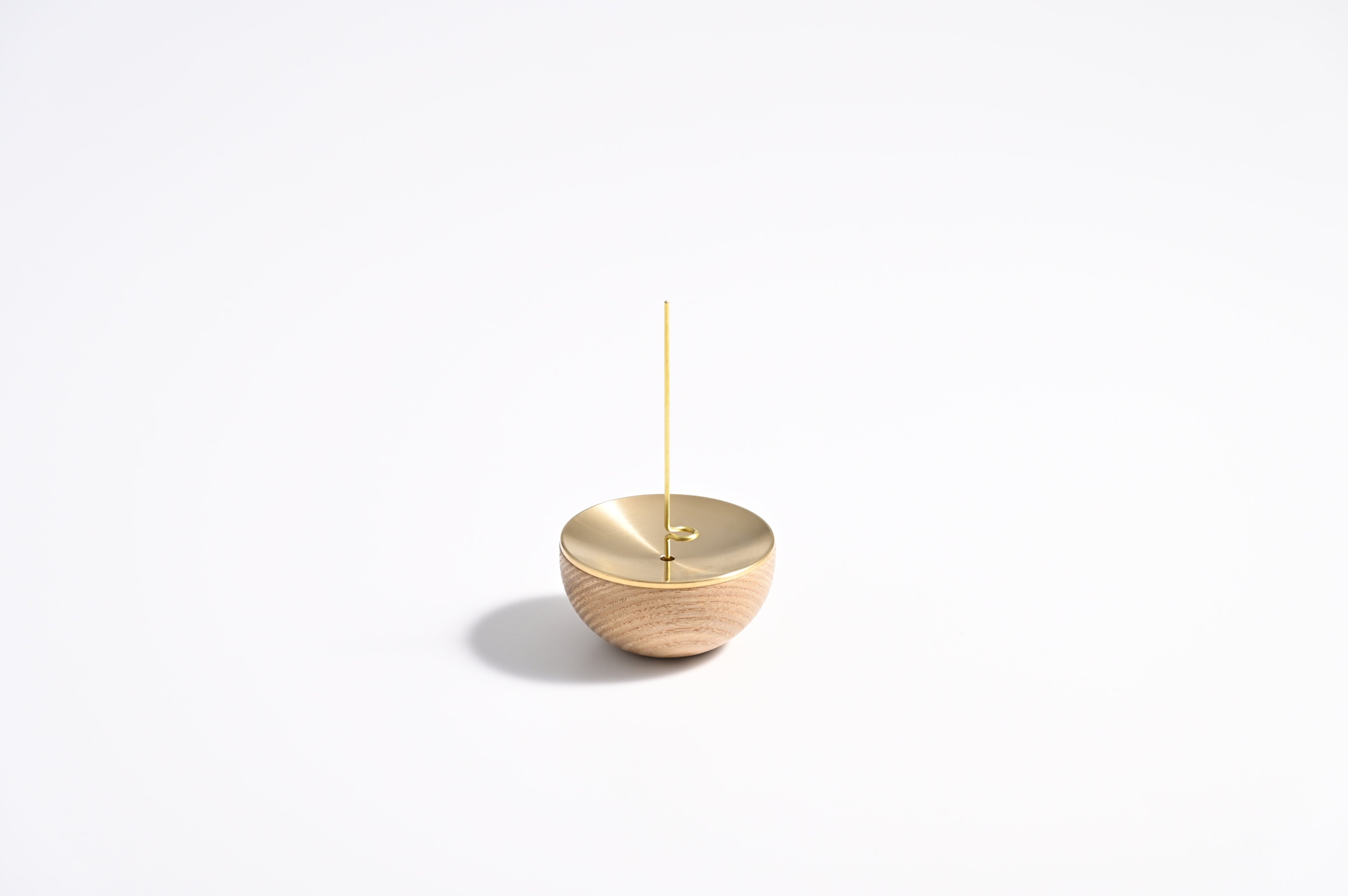 温かみのある木製のベースに真ちゅう製の受け皿を重ねることで、1つの調度品のような佇まいを目指しました。中央に向かって緩やかな傾斜を持つ金属パーツが、燃え落ちる灰を美しく受け止めます。異素材が調和するミニマルなデザインは、どのような空間にも静かに馴染みます。