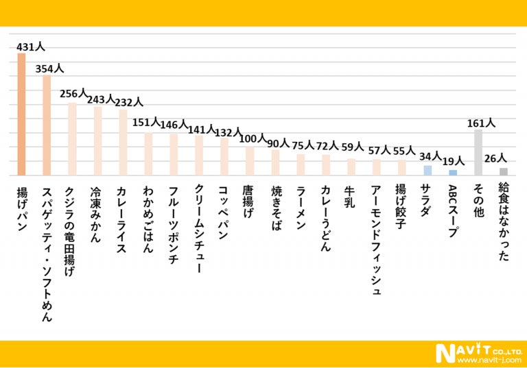 「もう一度食べたいと思う給食メニューは何ですか?」という質問を複数回答可で行ったところ、「揚げパン」が431人、「スパゲッティ・ソフトめん」が354人、「クジラの竜田揚げ」が256人という順になりました。
