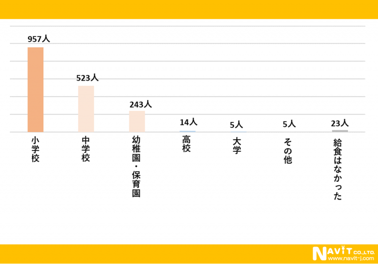 「いつ給食がありましたか?」という質問を複数回答可で行ったところ、「小学校」が957人、「中学校」が523人、「幼稚園・保育園」が243人という順になりました。